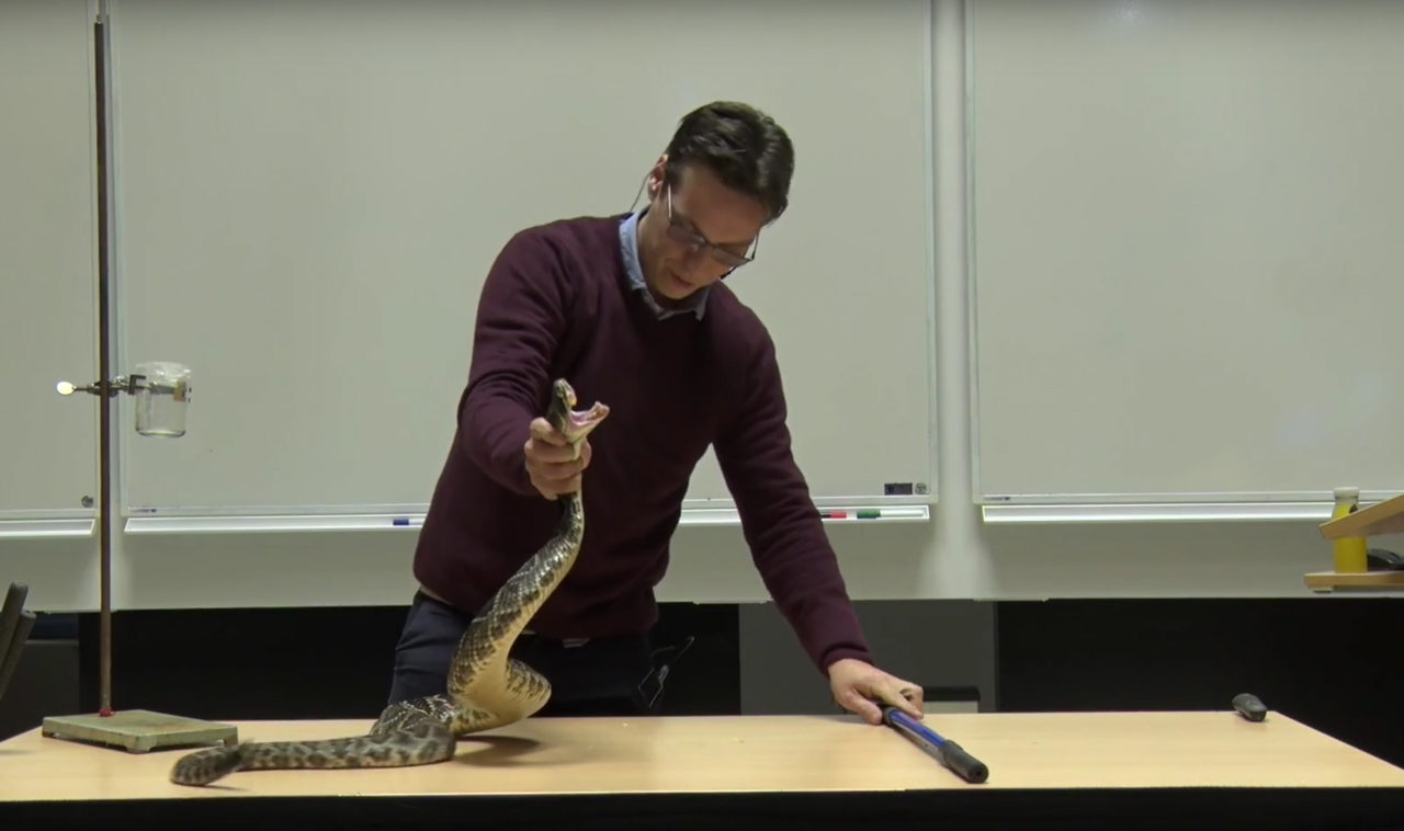 Wat is de lichamelijke reactie op een beet van een gifslang? En hoe werkt het melken van slangen om tot nieuwe medicijnen te komen? Hoogleraar Farmacologie Jan Danser (Erasmus MC) en slangengifspecialist Richard Mastenbroek vertellen het in een lunchlezing van SG Erasmus en de MFVR (Medische Faculteits Vereniging Rotterdam). Mastenbroek melkt live een ratelslang (vanaf 21:30 u.) en tijdens de lezing laten ze zien wat het vers gemolken gif van de ratelslang en dat van een zaagschubadder doet met het bloed van Jan Danser.