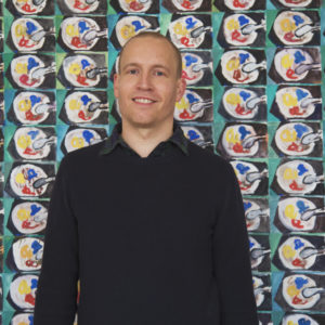 “Zoals je ziet, werk ik veel met herhaling”, zegt Marijn van Kreij, kunstenaar uit Amsterdam en winnaar van de prijsvraag voor het beste project voor nieuwe kunst in de bibliotheek. Het grootste deel van het werk van Marijn bestaat inderdaad uit enorme muurschilderingen met zich herhalende patronen, en de muurschildering die in de nieuwe bibliotheek komt te hangen vormt hierop geen uitzondering. “Voor dit kunstproject heb ik voorgesteld om studenten en personeel aan de muurschildering te laten meewerken. Ik wilde al heel lang een keer samen met mensen kunst maken, dus dit was mijn kans”, legt Marijn uit.