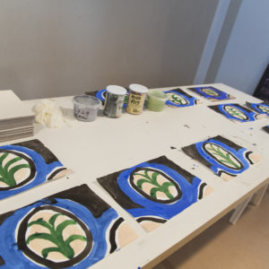Als de eerste studenten de ruimte in komen lopen laat Marijn zien welk patroon ze op de lege tegels moeten schilderen. “Ik vind het erg mooi dat iedere tegel anders wordt. Het ontwerp is weliswaar hetzelfde, maar de penseelstreken zijn altijd anders”, merkt de kunstenaar op.