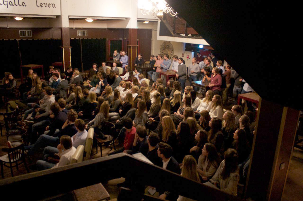 Onder leiding van hoogleraar Wiep van Bunge doen de vertegenwoordigers hun verhaal op het krakkemikkige podium van de knusse sociëteit. De zo’n 150 aanwezigen, studentikoos gekleed, kijken toe.