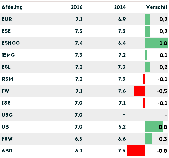 Alleen op het thema ‘efficiëntie’ is geen verbetering te zien: daar scoort de EUR net als in 2014 een 6,2 op, het laagste cijfer van de acht thema’s waar onderzoek naar is gedaan. De hoogste cijfers geven de medewerkers op vragen in de thema’s ‘loyaliteit’ en ‘verloopbestendigheid’, beide thema’s krijgen gemiddeld een 7,8.