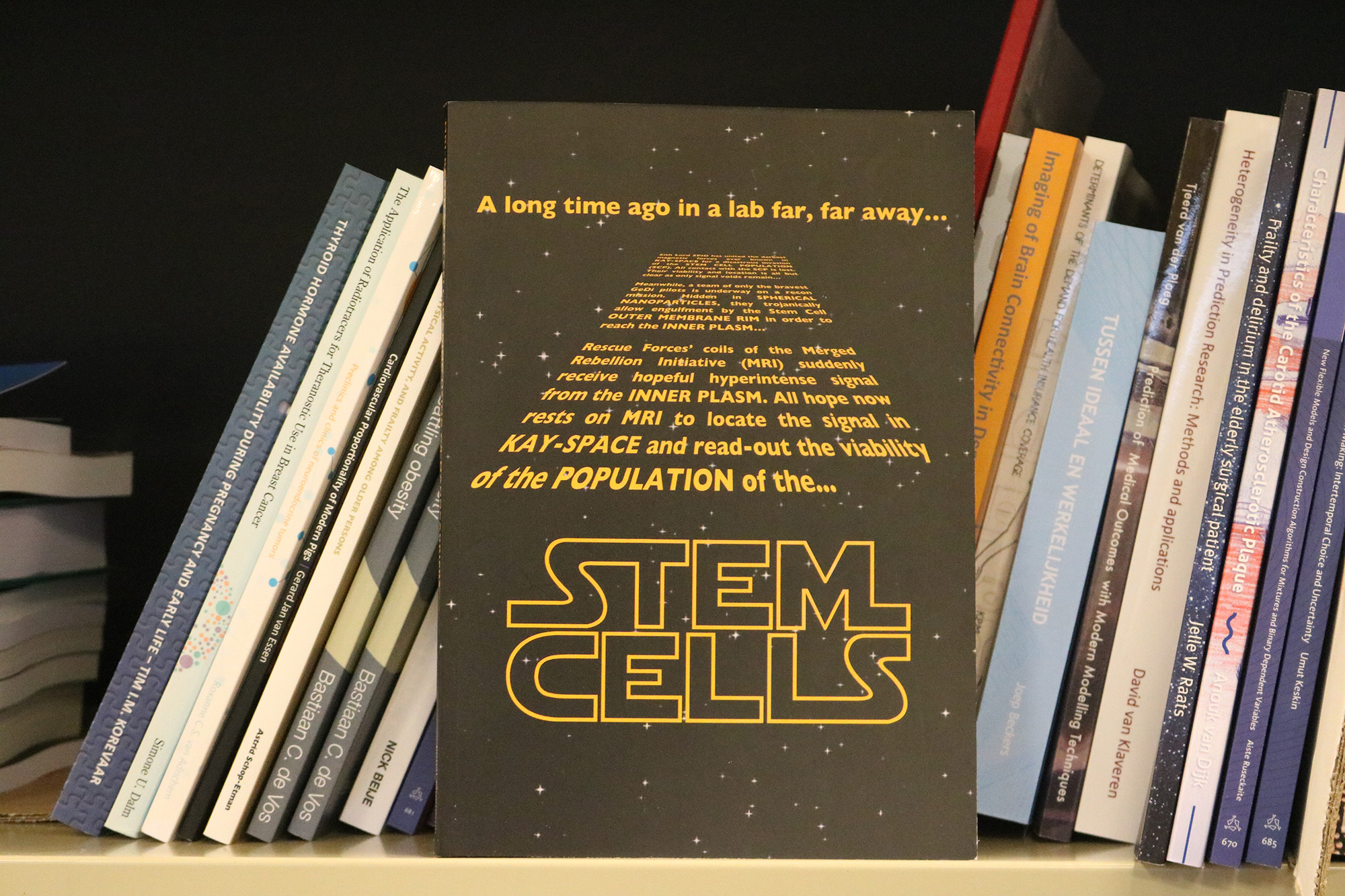 “Ik ben groot Star Wars-fan. Dus dat moest op de cover. Maar het is natuurlijk ook een metafoor. In het onderzoek heb ik de gadolinium-liposomen, die wit zijn op een MRI-scan, afgezet tegenover een stof die zwart is. Wit versus zwart, dan kom je al gauw op de bright side tegen de dark side. Bovendien vond ik Star Wars een goede analogie voor een promotie: je wordt in een zwart gat gegooid en er gaan lichtjaren voorbij tot het eindelijk af is. Daarnaast heeft iedereen ooit wel een strijd tussen een dark en een bright side in zijn leven. Bij mij was dat het werken met proefdieren.”