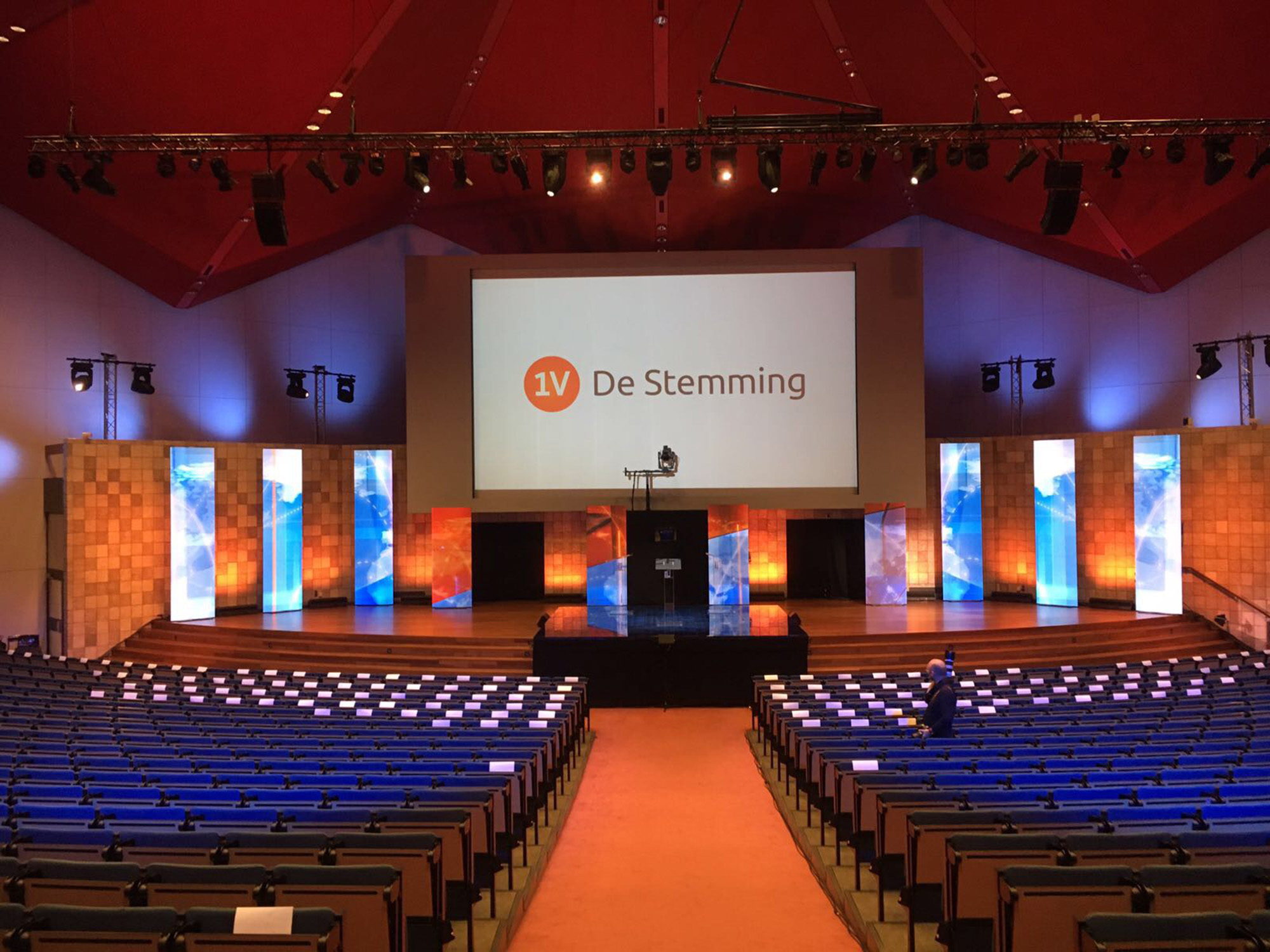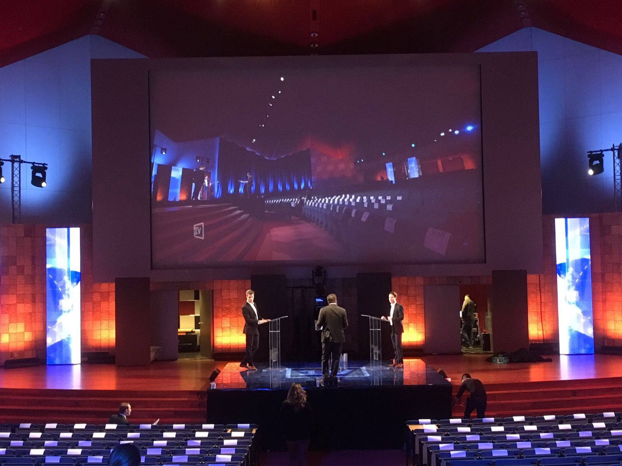 Nog een uur te gaan tot het debat begint. De Aula is bijna vol. Aanwezigen krijgen door EenVandaag filmpjes over de verkiezingen voorgeschoteld.