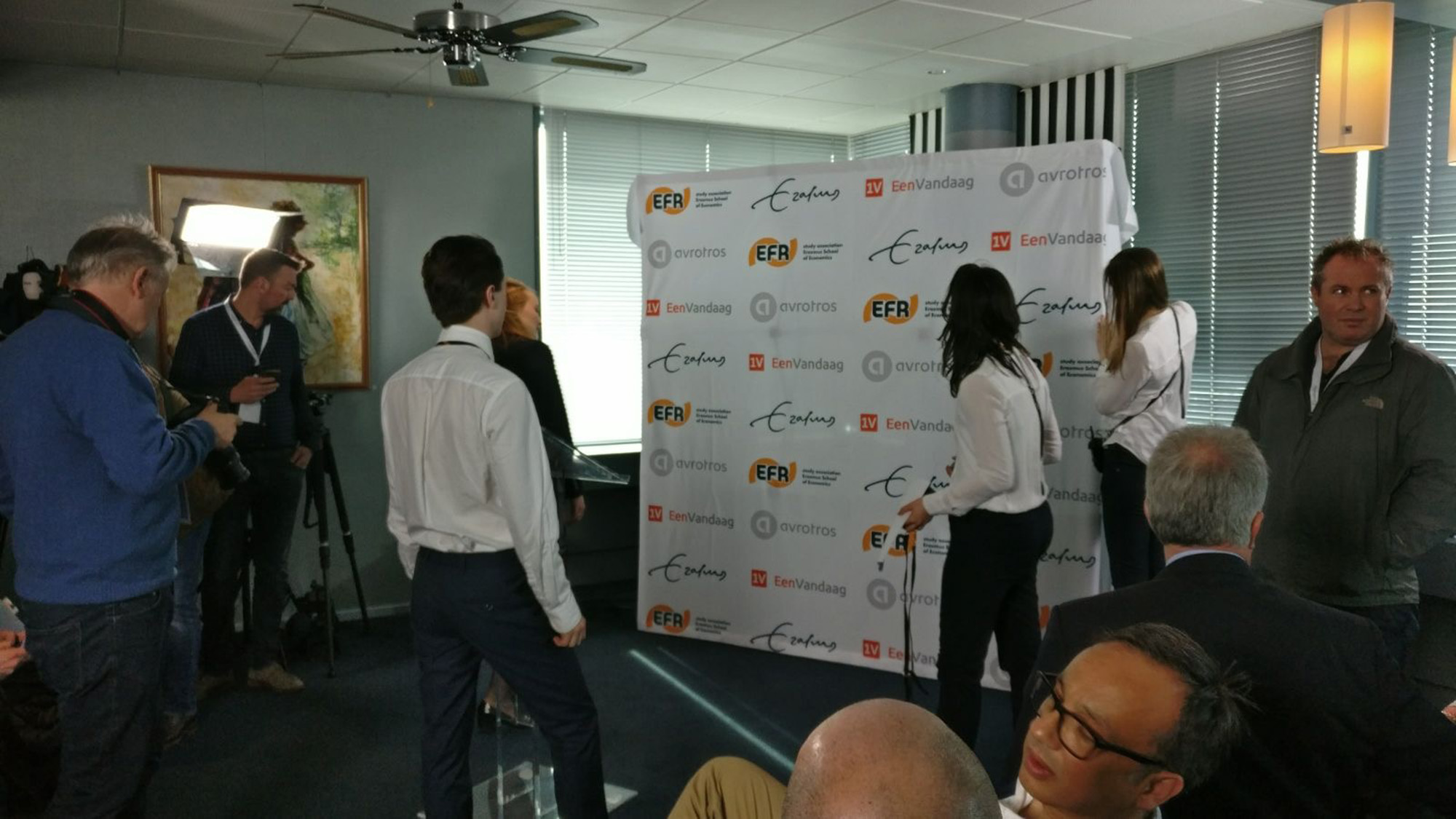 Paniek vanochtend. Het scherm met de logo’s van EenVandaag en de EFR, waarvoor Mark Rutte zodadelijk tijdens de persconferentie plaats zal nemen, was kwijt. Maar inmiddels is het gevonden. “De bezorger had hem in de auto laten staan”, zegt een student van de EFR. “We hebben hem net op tijd gevonden.”