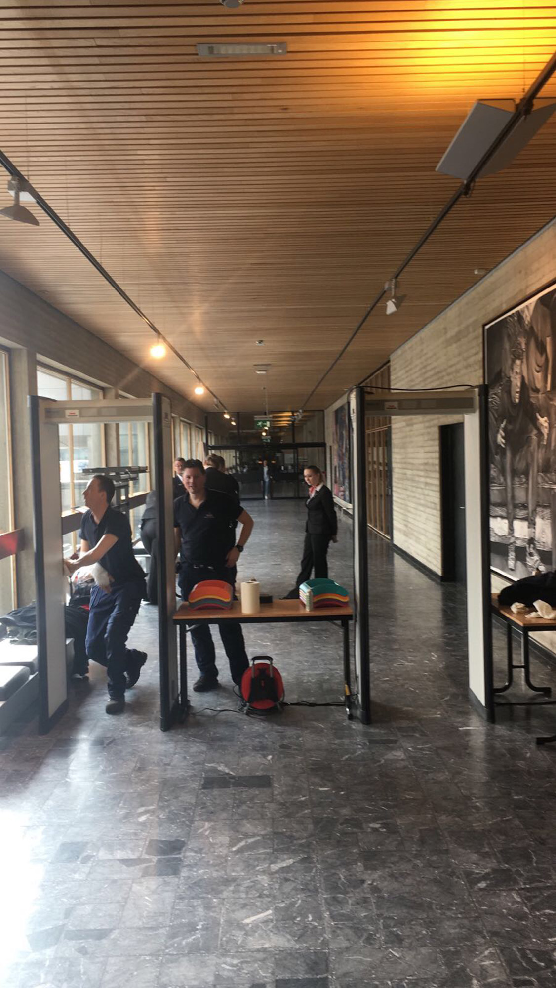 De eerste beveiligingspoortjes zijn geplaatst. Ze staan in de hal tussen gebouwen A en C en bij de ingang van de Aula. Iedereen die het A-gebouw in wil moet door de poortjes. De beveiligers hebben hun positie ingenomen. Alleen met een bandje kom je er nog in.