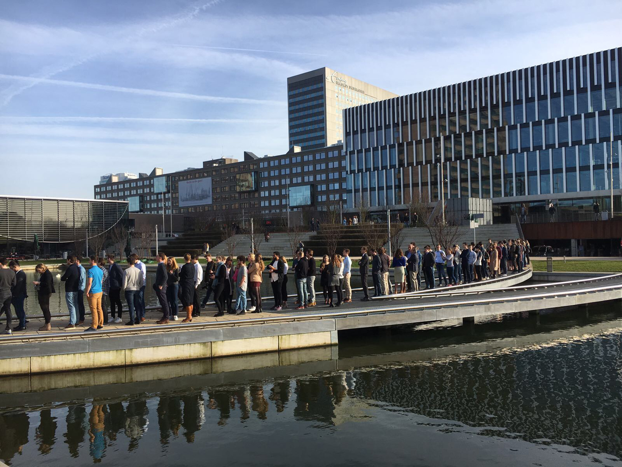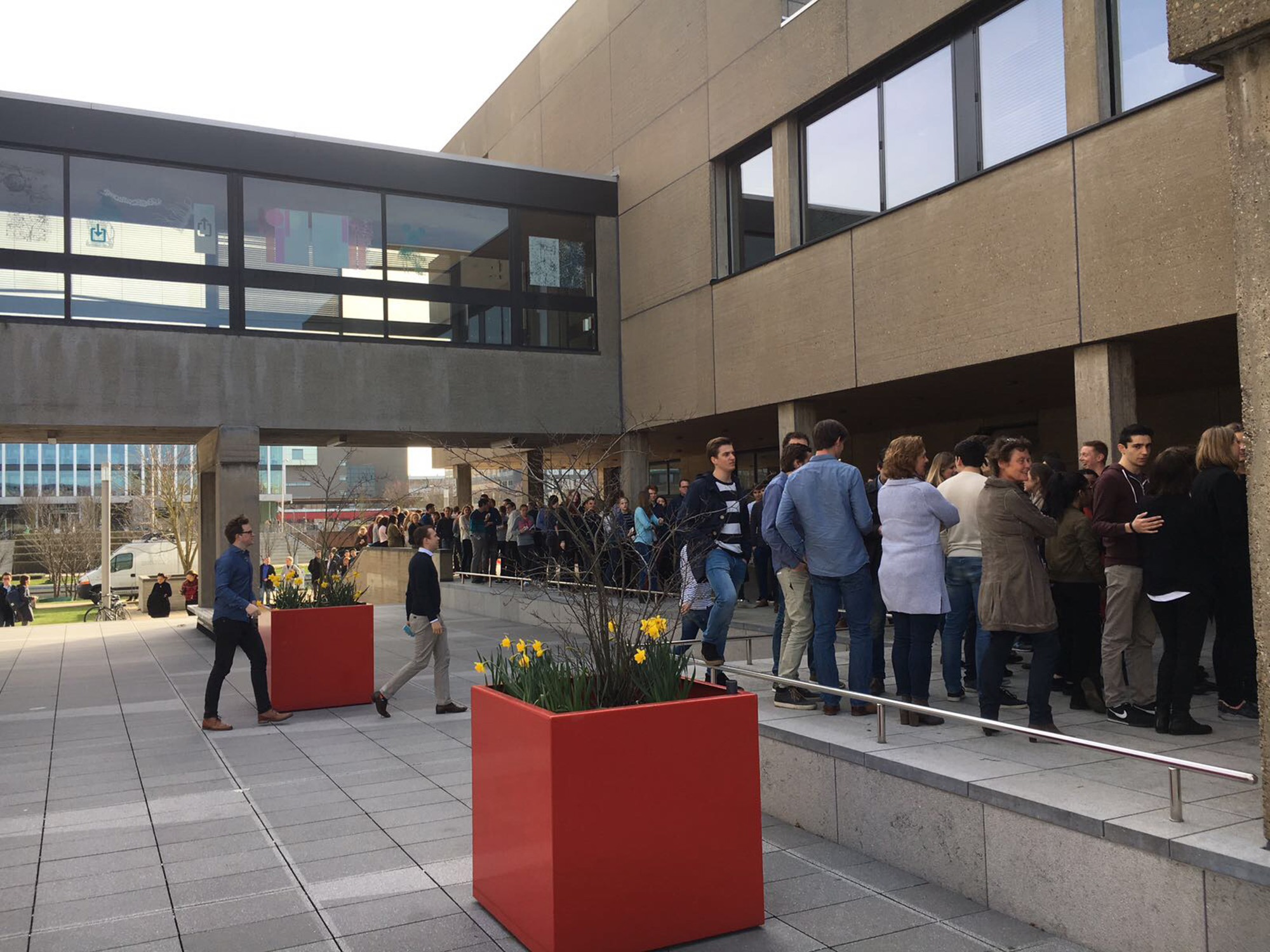 “Dit hebben we nog niet vaak meegemaakt”, zegt een medewerker met een kantoor vlakbij de Aula. “Er komen hier toch vaak genoeg belangrijke mensen langs. Willem-Alexander, Ban Ki-moon. Maar toen was de beveilging echt niet zo streng als nu. We zijn nu zelfs allemaal door de AIVD gescreend, dacht ik.”