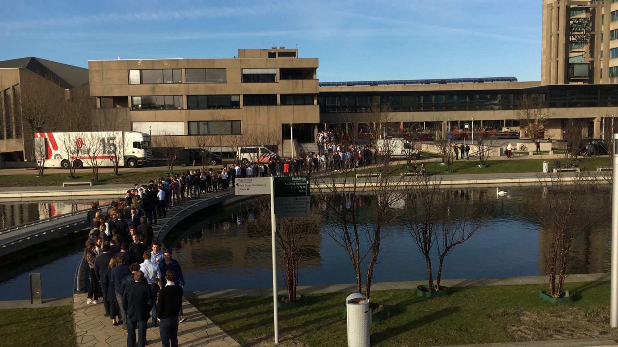 Om 14.00 uur houdt Mark Rutte een persconferentie op de zeventiende verdieping van het Tinbergengebouw. Er worden meer dan honderd journalisten verwacht. Van The Wall Street Journal tot De Kralingsche Ster, voor iedereen ligt een kaartje klaar. De campus wordt langzaamaan overgenomen door de media, ook door veel buitenlandse journalisten. EM-redacteur Jasper Monster kwam al Franse, Duitse en Italiaanse journalisten tegen.