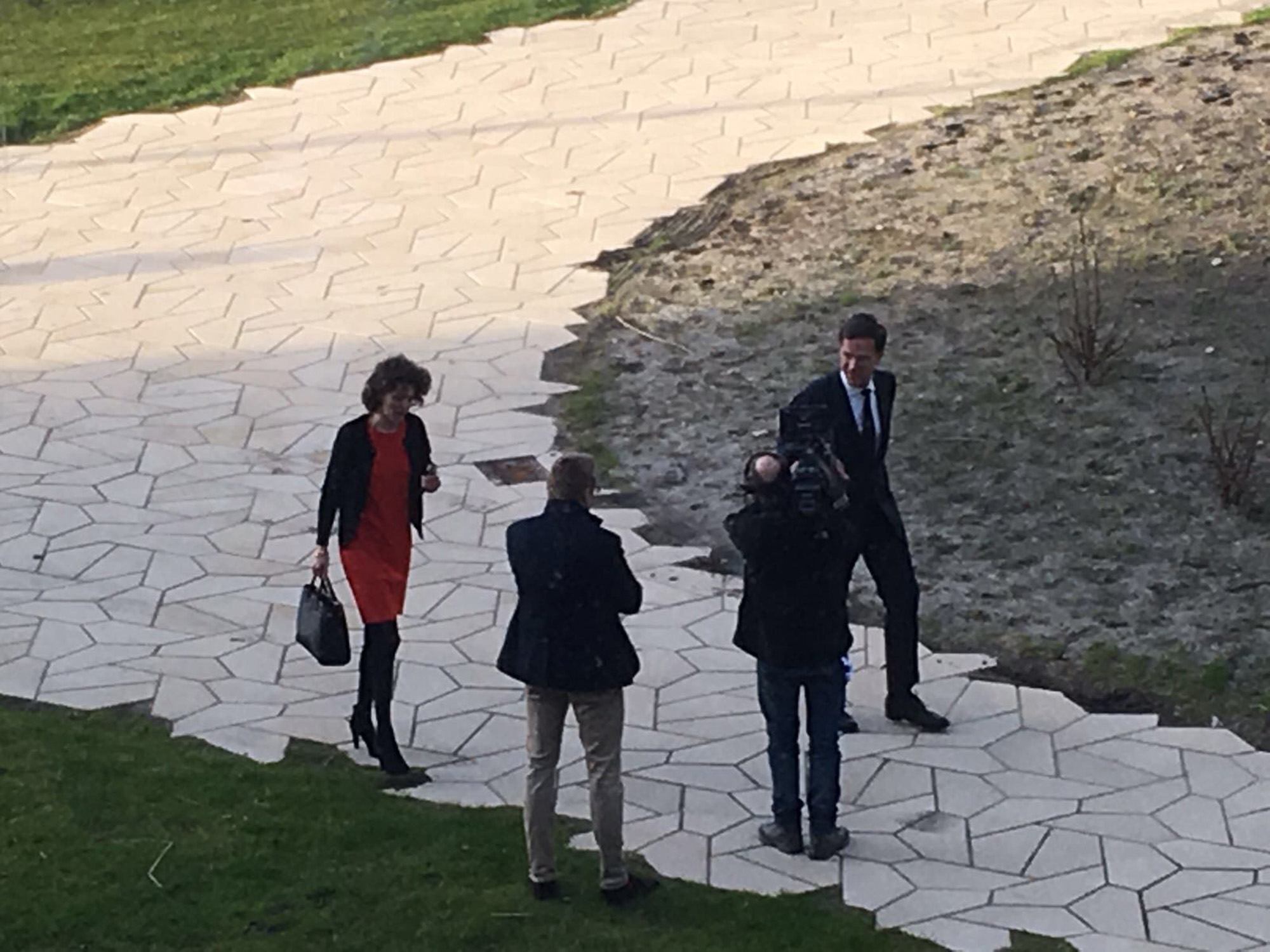 Waar Rutte nog te voet de halve campus overstak, wordt Wilders voorgereden. Maar ze zijn er allebei, dus we kunnen zo van start.