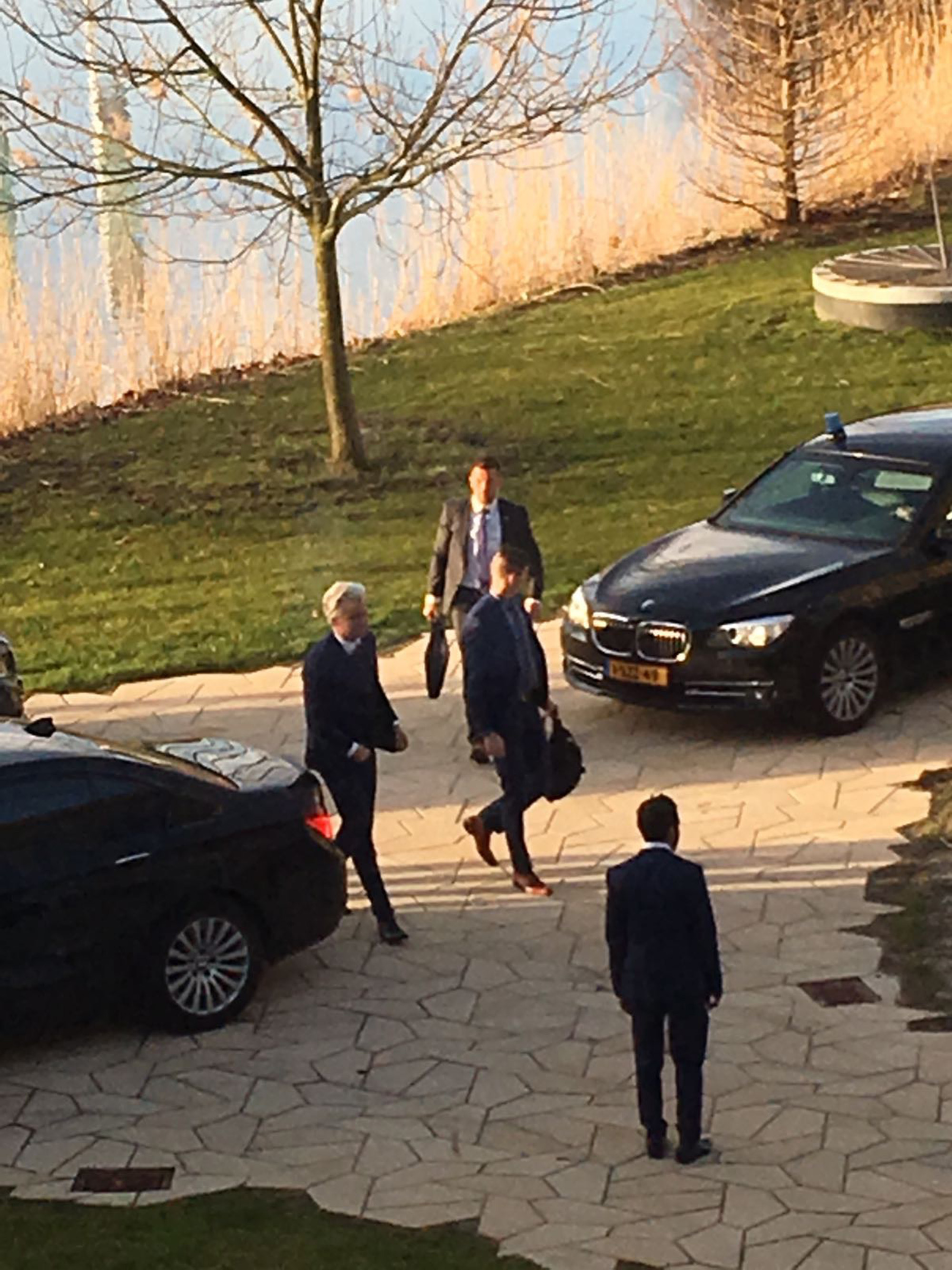 EM-redacteur Jasper Monster staat inmiddels al een half uur voor het raam te wachten op de aankomst van Mark Rutte en Geert Wilders, samen met een batterij fotografen. Het wachten wordt beloond: Rutte is binnen. (Maar die fotografen hebben vast een scherpere foto.)