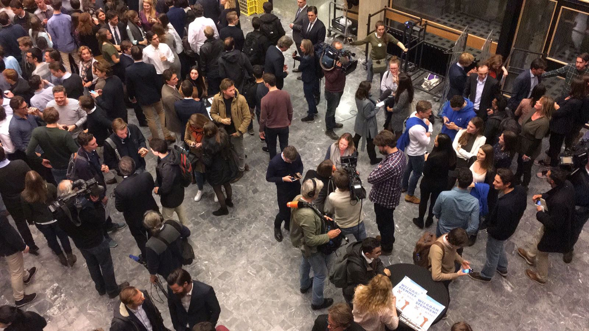 Het duurt nog twee uur voor het debat begint, maar studenten staan al massaal in de rij. EM-redacteur Jasper Monster heeft ze even snel geteld: meer dan honderd studenten wachten tot ze naar binnen mogen. “Vanwege de vele veiligheidsmaatregelen had de organisatie al opgeroepen om vroeg naar het debat te komen. Ze moeten nog even geduld hebben, want er mag nog niemand in.”