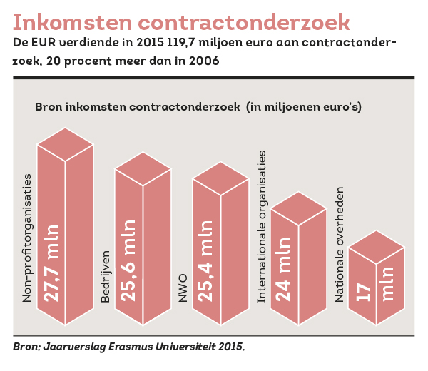 Uit de jaarrekeningen van de Erasmus Universiteit blijkt dat steeds meer onderzoeksinkomsten uit de tweede en derde geldstroom komen. De baten uit contractonderzoek (alle onderzoeksinkomsten die níet uit de eerste geldstroom komen) zijn in tien jaar tijd met 20 procent toegenomen: van 100 miljoen euro in 2006 tot 120 miljoen in 2015. Dat geld komt ook uit de onderzoeksbaten van het Erasmus MC en de verschillende bv’s die bij de universiteit horen. Het bedrijfsleven is met 25,6 miljoen euro goed voor zo’n 20 procent van de inkomsten uit contractonderzoek van de Erasmus Universiteit.