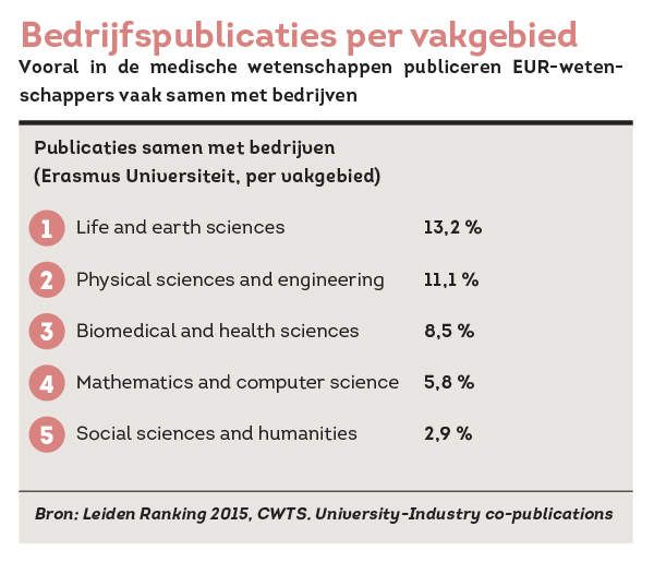 Speciaal voor Erasmus Magazine keek Tijssen naar de allernieuwste, nog niet gepubliceerde cijfers. Daaruit blijkt dat ongeveer 7,5 procent van alle publicaties van de EUR in samenwerking met een bedrijf geschreven werd. “Dat is vrij veel. De Erasmus Universiteit zit in de top van Nederland.” Die samenwerking met bedrijven komt vooral voor bij de Health and life sciences, dus via het Erasmus MC.