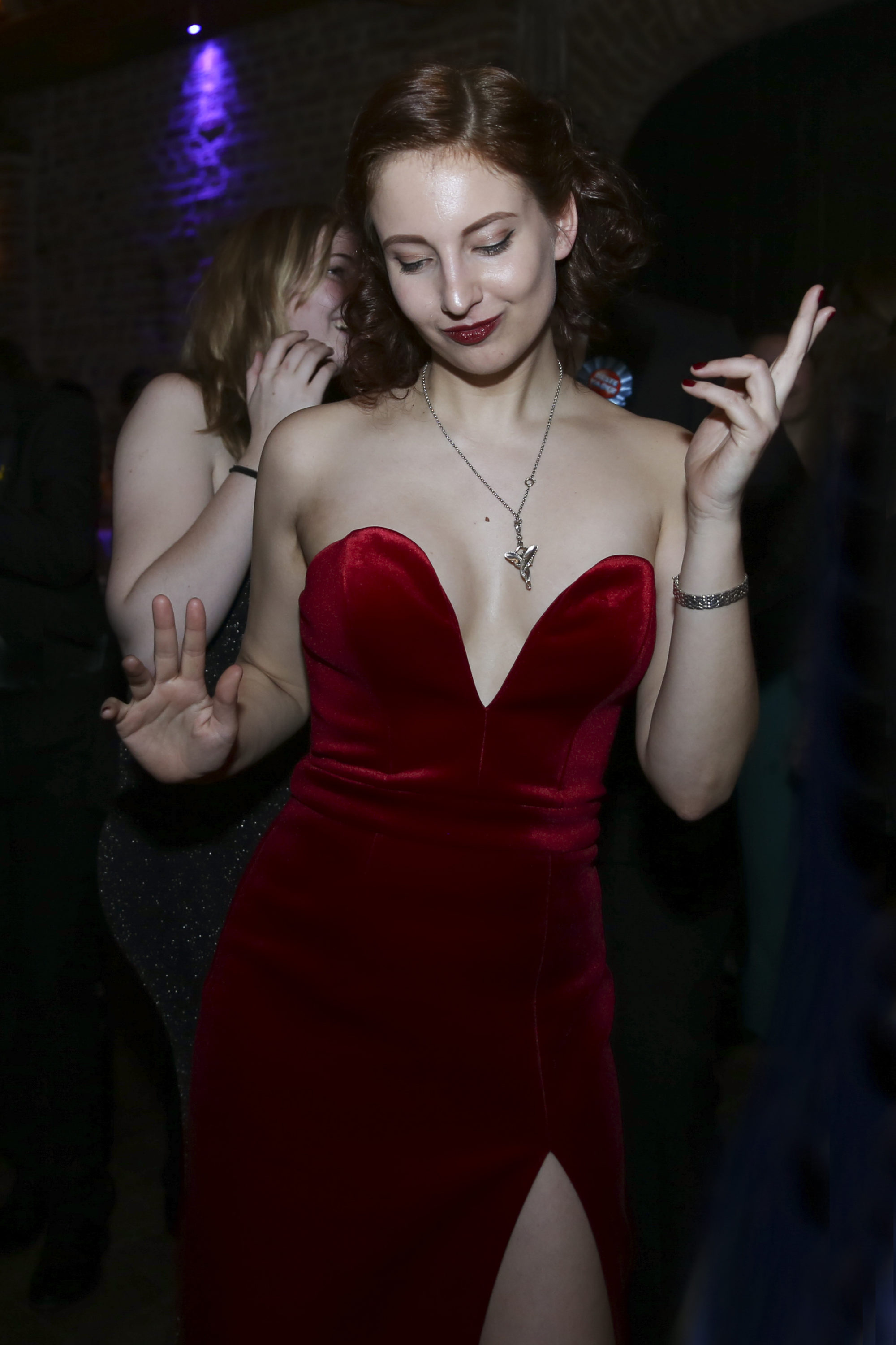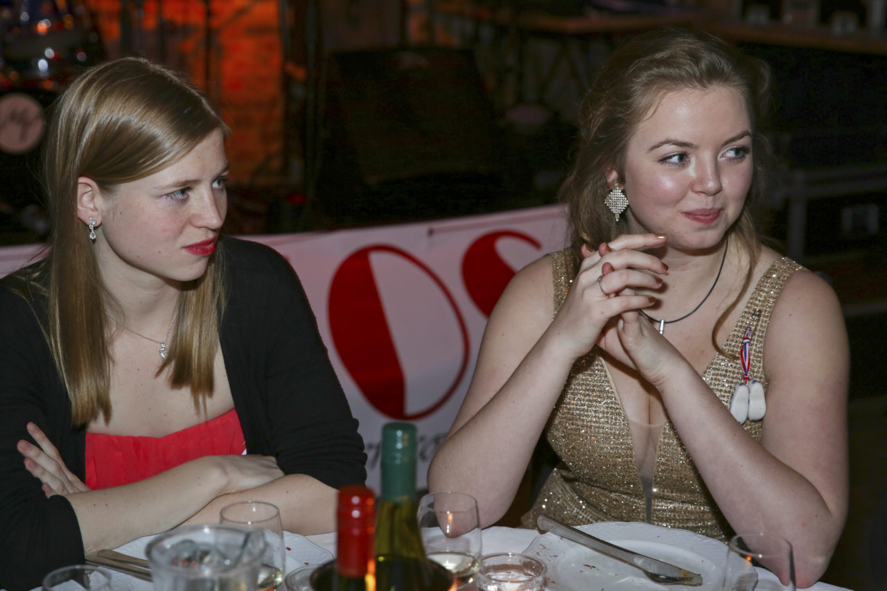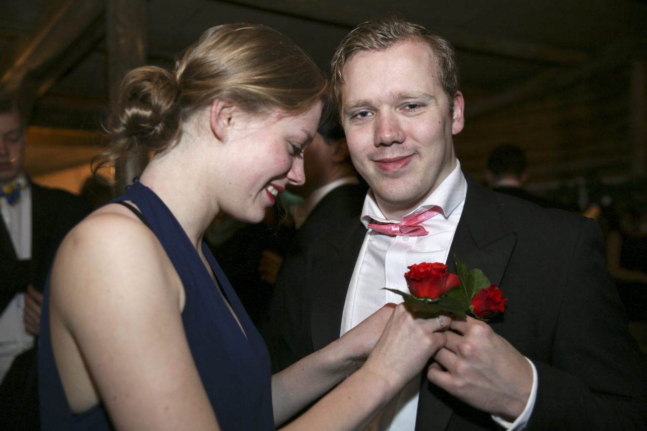 Of het echt iets zegt over de uitkomst van de avond, moet nog blijken. Wat wel direct opvalt tijdens de eerste rondgang door de eetzaal, waar de zestig studenten opvallend rustig van een uitgebreid driegangendiner genieten: de prachtige (maar lange) jurken van de aanwezige vrouwen. Deze kledingkeuze zorgt er ook voor dat enkele mannen zich direct kunnen onderscheiden door als reddende engel op te treden. “Mijn jurk is tien centimeter te lang, ik struikel de hele tijd”, zegt Jojanneke, terwijl haar date Toine met een hand vol veiligheidsspelden naast haar op de grond zit. “Gelukkig is hij mijn redder in nood.”