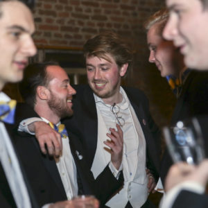 “Waarschijnlijk is iedereen toch wat rustiger dan tijdens een normaal feest op de soos”, verklaart Sander, die zelf ook achteraan in de rij is gaan staan. “Het is het belangrijkste feest van het jaar en dan wil je het liefst niet stomdronken over de bar hangen. En je wilt er sowieso nog goed uitzien voor de foto.” Nora, die als eerstejaars haar debuut maakt op het gala, gebruikt dezelfde tactiek. “Ik kijk dit eerste jaar de kat uit de boom en wil vooral een leuke avond hebben.” En, lukt dat een beetje? “Zeker, iedereen is mooi en het is heel gezellig.”