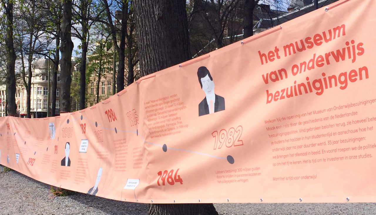 “We willen de politici historisch bewustzijn bijbrengen”, vertelt Jarmo Berkhout, voorzitter van de Landelijke Studentenvakbond. Hij staat bij het spandoek en is heel tevreden over dit ‘Museum van Onderwijsbezuinigingen’.