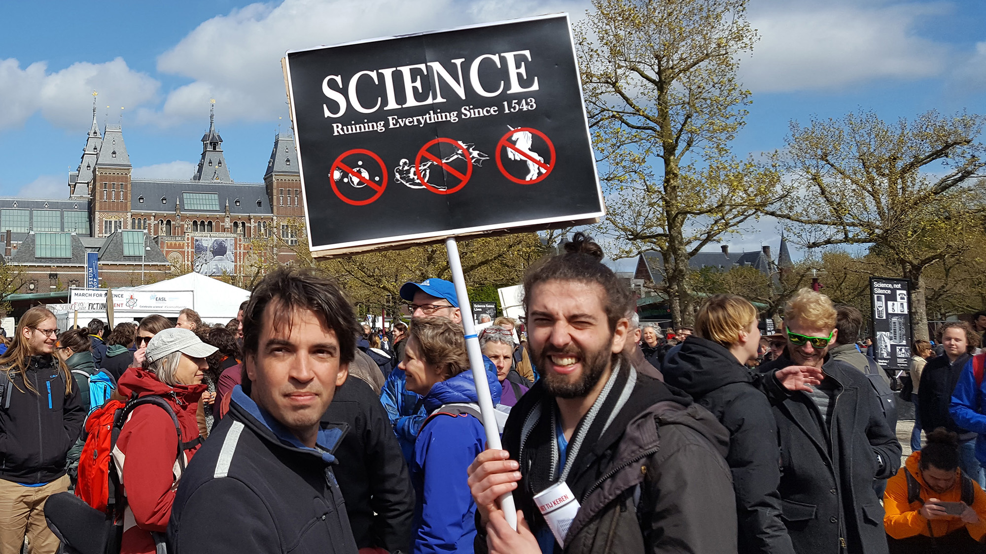 In zeshonderd steden wereldwijd brachten mensen zaterdag een steunbetuiging aan de wetenschap. Ook in Amsterdam kwamen (volgens de organisatie) drieduizend mensen bijeen voor een March for Science. Hoewel wetenschappers niet graag demonstreren, blinken ze wel uit in creatieve protestborden.