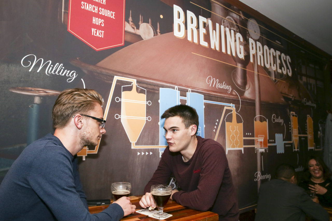 Het is alsof de eigenaar ‘de Locus’ gekopieerd heeft en met een hip bezempje door de zaak is gegaan. Donker, maar met een infographic van het ‘brewing process’ op de muur geschilderd. Flesjes in het zicht, maar omlijst met kleurig achtergrondlicht. Een bruine kroeg, maar dan 2.0.