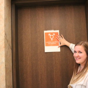 “Ik vind het een fantastisch idee. Wij zijn een ruimdenkende universiteit, dus als we actie ondernemen voor kansarme kinderen in Rotterdam of voor vluchtelingen, dan moeten we er ook voor zorgen dat we de LGBT-gemeenschap respecteren. Vrouwen zullen zich misschien niet meteen op hun gemak voelen om in het bijzijn van een man te gaan poepen of hun make-up te doen, en een man denkt waarschijnlijk hetzelfde over een boodschap doen naast een meisje. Maar overschakelen naar genderneutrale toiletten is onderdeel van een verandering in mentaliteit waarbij geslachtsgelijkheid een doodnormale zaak is. Ik denk dat mensen na een tijdje er gewoon aan zullen wennen om naar dezelfde wc te gaan.”