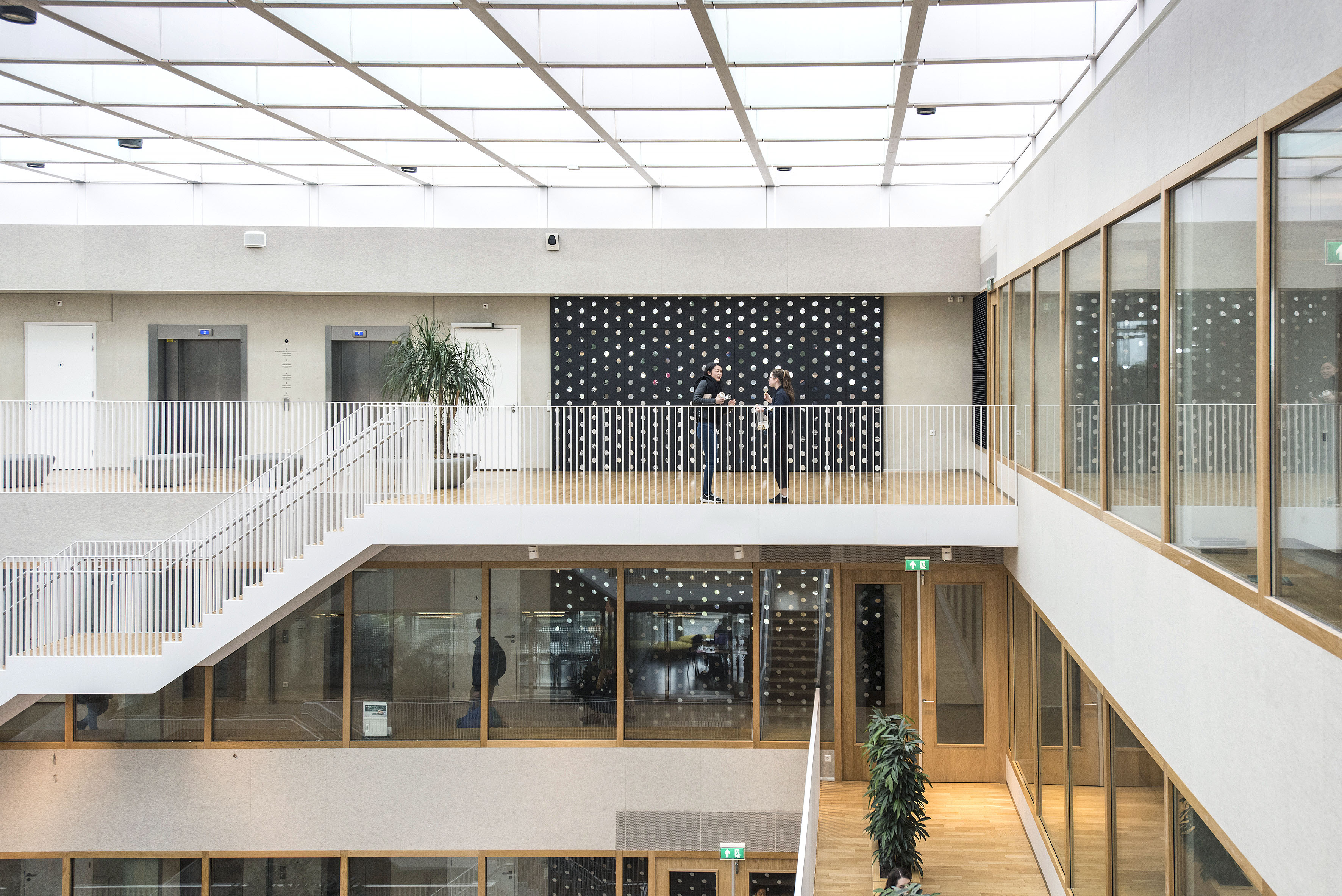 ↑ Ogenblikken, Willem Oorebeek, 2015 – Voor veel studenten die dagen in Polak doorbrengen komt het misschien als een verrassing, maar de ‘spiegelmuren’ op de vijf achterwanden in het gebouw zijn kunstwerken. “Het komt niet helemaal uit de verf. Daarvoor zit de kunst te veel geïntegreerd in het gebouw. Ik weet niet of ik het heel mooi vind, maar ik vind het in ieder geval aangenaam. De weerspiegeling zorgt elke keer voor een ander beeld. Het werk speelt heel erg met de lijnen van het gebouw. Mijn tip: ga naar de bovenste verdieping. Daar is natuurlijk licht en dat maakt het kijken veel aangenamer.” Oorebeek is ook bekend van zijn werk aan de gevel van het Bilderberg Parkhotel in het centrum (met de stippen).