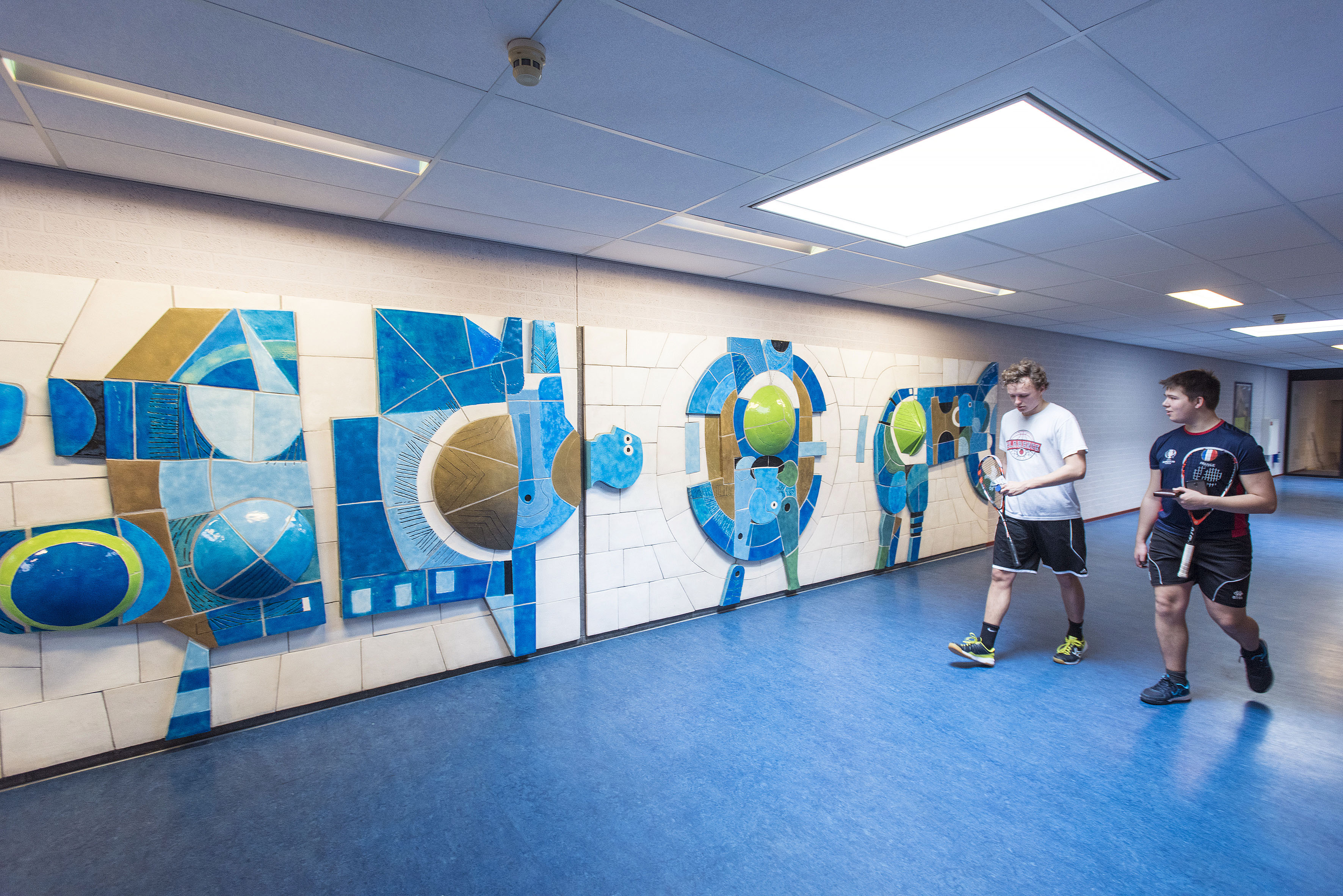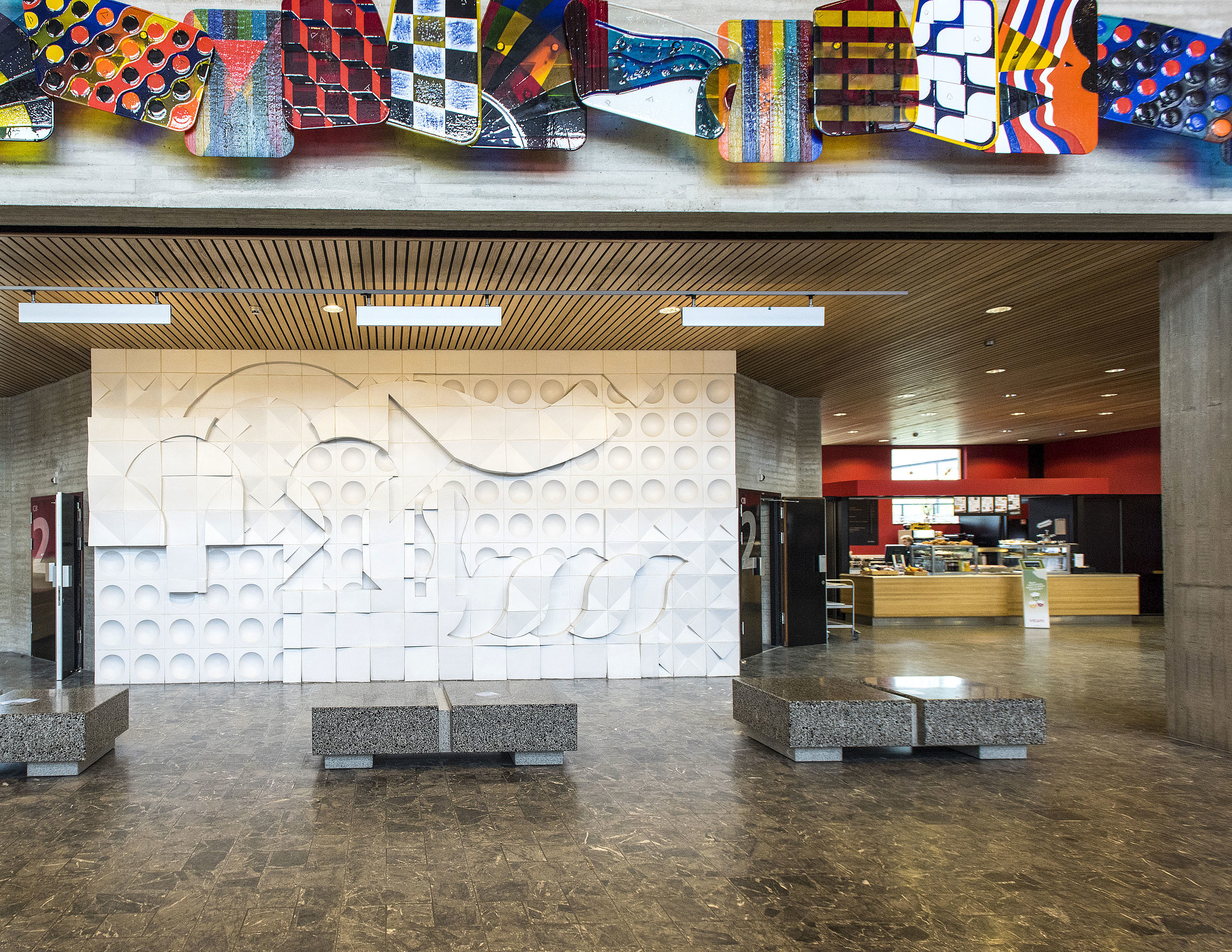 ↑ Tegelwand, Bouke Ylstra, 1969 – Diep verborgen in het Sportgebouw, met het geluid van stuiterende basketballen op de achtergrond, hangt een van de favorieten van La Rivière. “Heel bizar, want er loopt hier geen mens, maar dit is echt heel goed. De tegelwand werkt het beste om van buitenaf of van een afstand te bekijken. Het – en dat bedoel ik totaal niet negatief – doet ook denken aan de kunst die vroeger in elk zwembad hing. Gedateerd, maar in kleurgebruik past het heel erg bij de universiteit. Ronde lijnen en vormen plus kleuren, tegendraads aan de architectuur. Dit soort kunst wordt ook niet veel meer gemaakt. Daarom vind ik dit soort werken ook extra tof, want de kunde om dit te maken lijkt verloren te gaan.” Op metrostation Stadhuis en in de Bredestraat hangen andere kunstwerken van Ylstra.