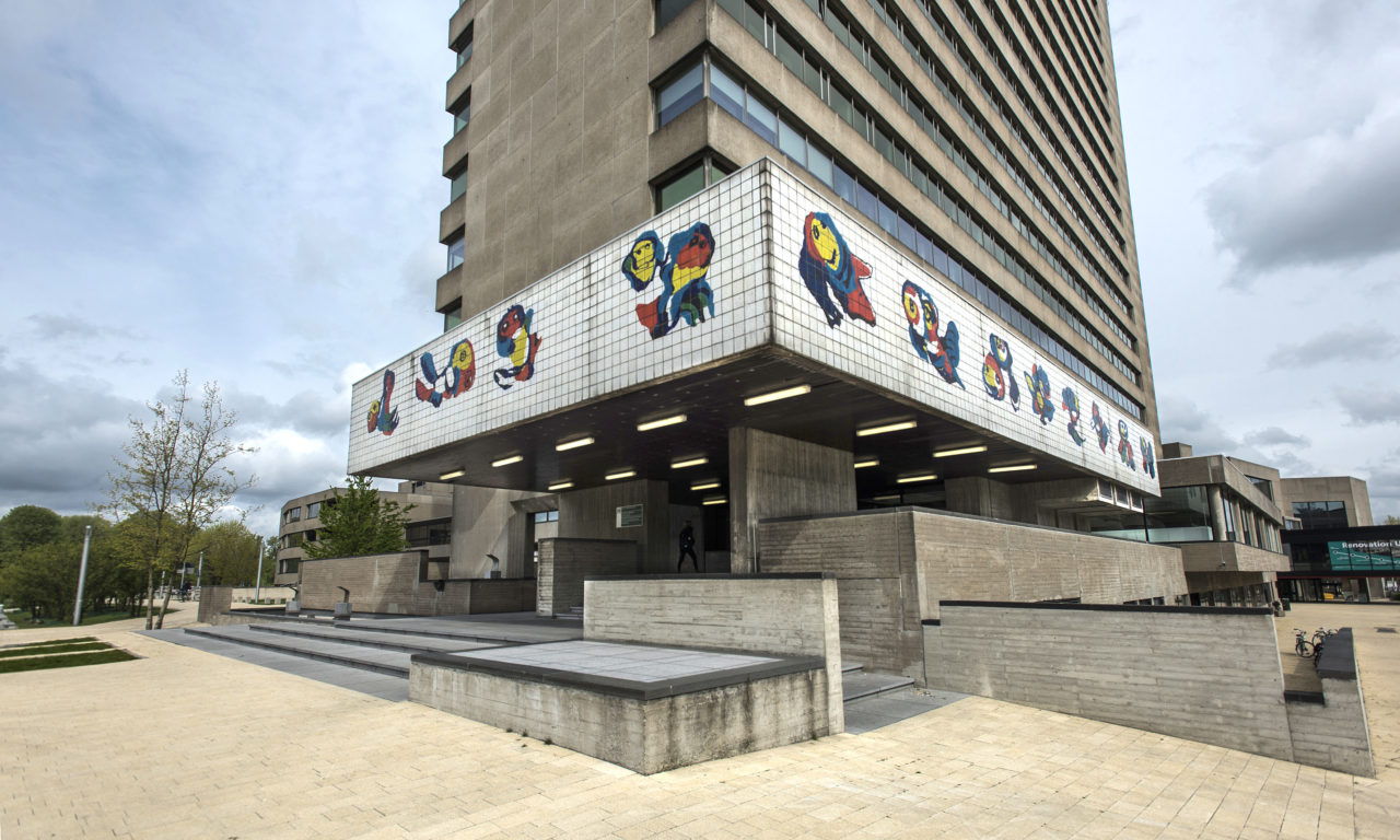↑ Zonder Titel, Karel Appel, 1969 – Het tegeltableau op het voormalige H-gebouw valt veel bezoekers van de campus waarschijnlijk niet meer op, maar La Rivière is onder de indruk. “Dat is juist zo knap, dat het werk geïntegreerd is in het gebouw en het voor iedereen zo vanzelfsprekend is. Die heldere kleuren vormen zo’n mooi contrast met dat keiharde, grijze gebouw. Het is een een-tweetje. Een dikke middelvinger naar de architectuur, dat wil ik er graag in zien. Dit tegeltableau is trouwens een schenking van de (still going strong) Meelfabriek Meneba. Appel is ook op andere plekken in Rotterdam te vinden, zoals aan de Technikon gevel van jeugdtheater Hofplein.”
