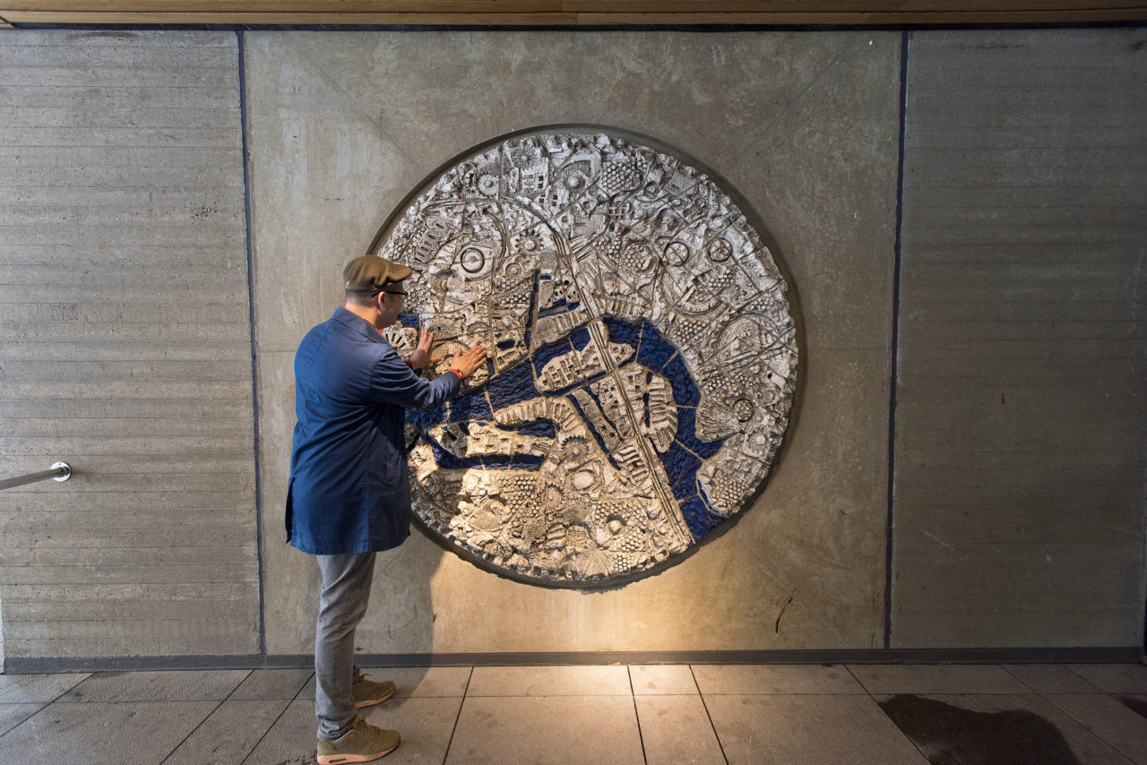 ↑ Rotterdam in keramiek, Piet van Stuyvenberg, 1969 – De locatie van het werk, verstopt achter een hekje naast de ingang van het Erasmus-gebouw, maakt de kunstenaar een beetje boos. “Het is een heel, heel slechte plek. Je lijkt wel in overtreding als je dit kunstwerk bekijkt. Terwijl het echt een betere plek verdient, want het is gewoon een mooi ding. De cirkel breekt qua vorm en materiaal heel mooi met het beton en de omgeving.” De drie stippen op het kunstwerk verwijzen naar de onderwijslocaties van de Nederlandsche Handels-Hoogeschool en Nederlandse Economische Hogeschool, de voorlopers van de Erasmus Universiteit. Het begon allemaal in 1913 aan de Blaak. In 1916 verhuisde de NHH naar de Pieter de Hoochweg en 1968 was de nieuwbouw van de NEH in Kralingen klaar (de huidige campus Woudestein).
