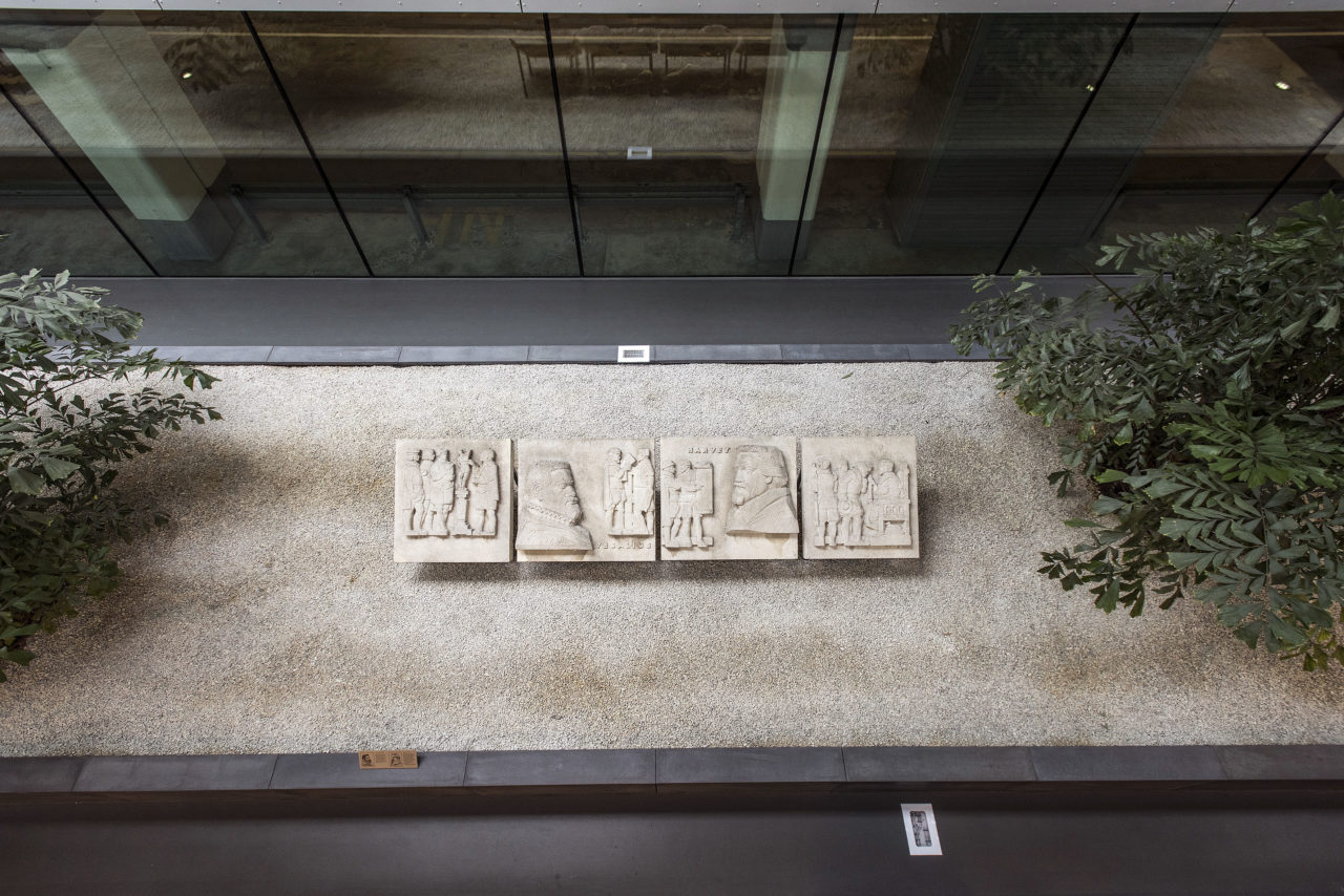 ↑ Wandreliëf(s), Cor van Kralingen, 1959 – Op Hoboken, tegenover de AKO in de centrale hal van het Erasmus MC, liggen ‘verstopt’ in wat plantenbakken deze reliëfs. “Leuk dat dit werk is teruggekomen, want het hing lange tijd bij de hoofdingang van het Dijkzigt-ziekenhuis. De reliëfs beelden ontwikkelingen uit van de medische wetenschap door de jaren heen. Het past heel goed bij het ziekenhuis. Dit soort werken wordt ook amper meer gemaakt, en is heel anders dan wat hier voor de rest te zien is. Dit kunnen veel meer mensen mooi vinden, want het is heel illustratief.” Wel beklaagt de kunstenaar zich wederom over de gekozen plek. “Als het kunstwerk op een mooie plek was verwerkt in de hal en de kijker ook de ruimte had gehad, was het veel beter geweest.” Van Kralingen is ook bekend van de acht waterdieren op/aan de hoeken van de Hofpleinfontein en de Twentse Ros op het dak van de voormalige Twentsche Bank aan de Blaak 28.