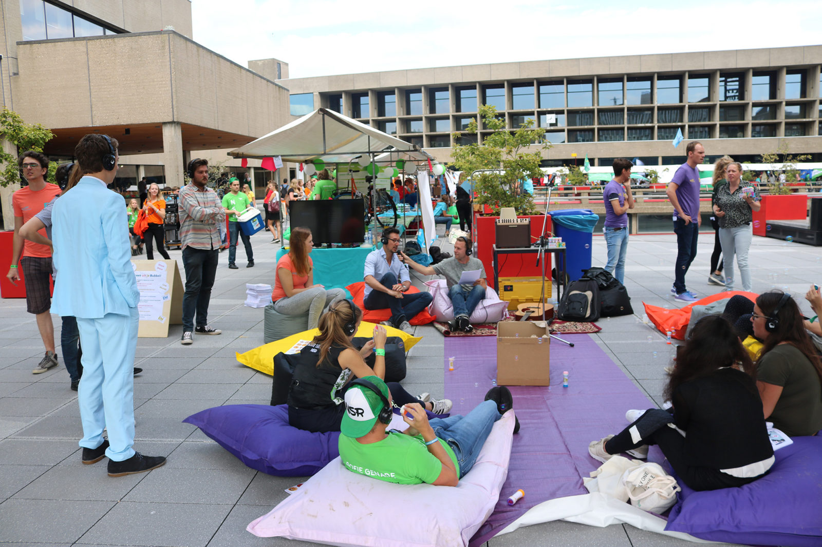 Veel zon, veel muziek en ongelooflijk veel indrukken. Op de informatiemarkt schreeuwen tientallen organisaties om de aandacht van eerstejaars, en dat lukt de ene beter dan de andere. EM maakte een rondje langs de kramen.