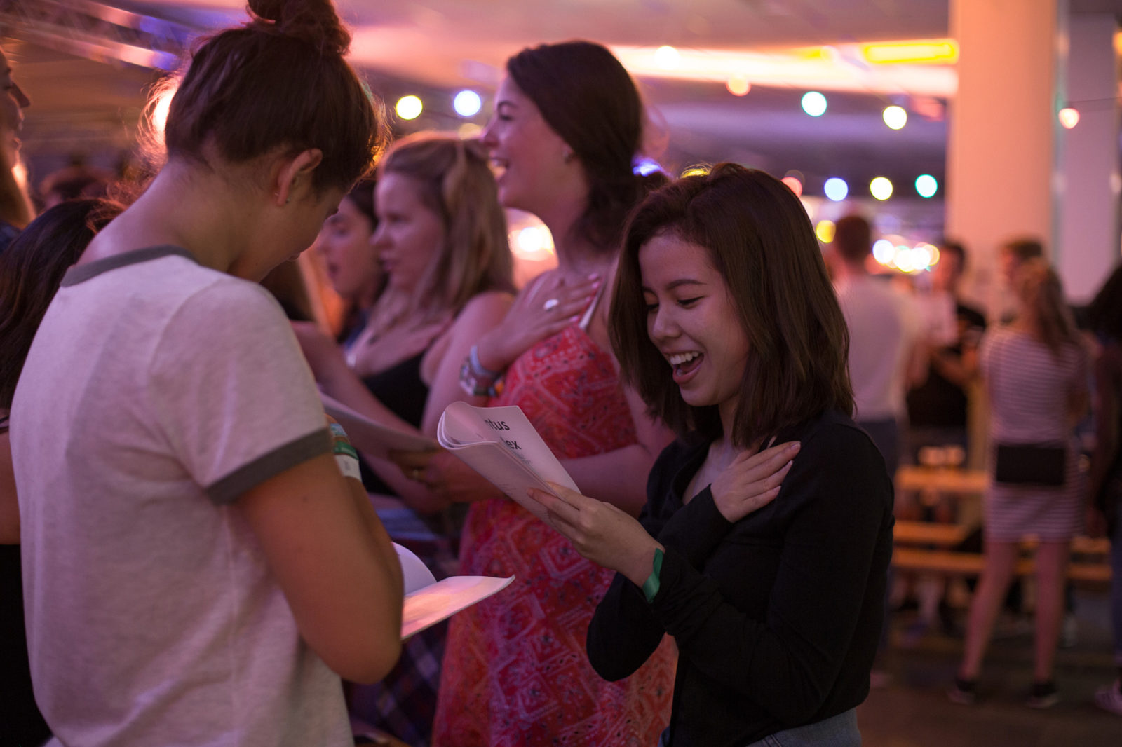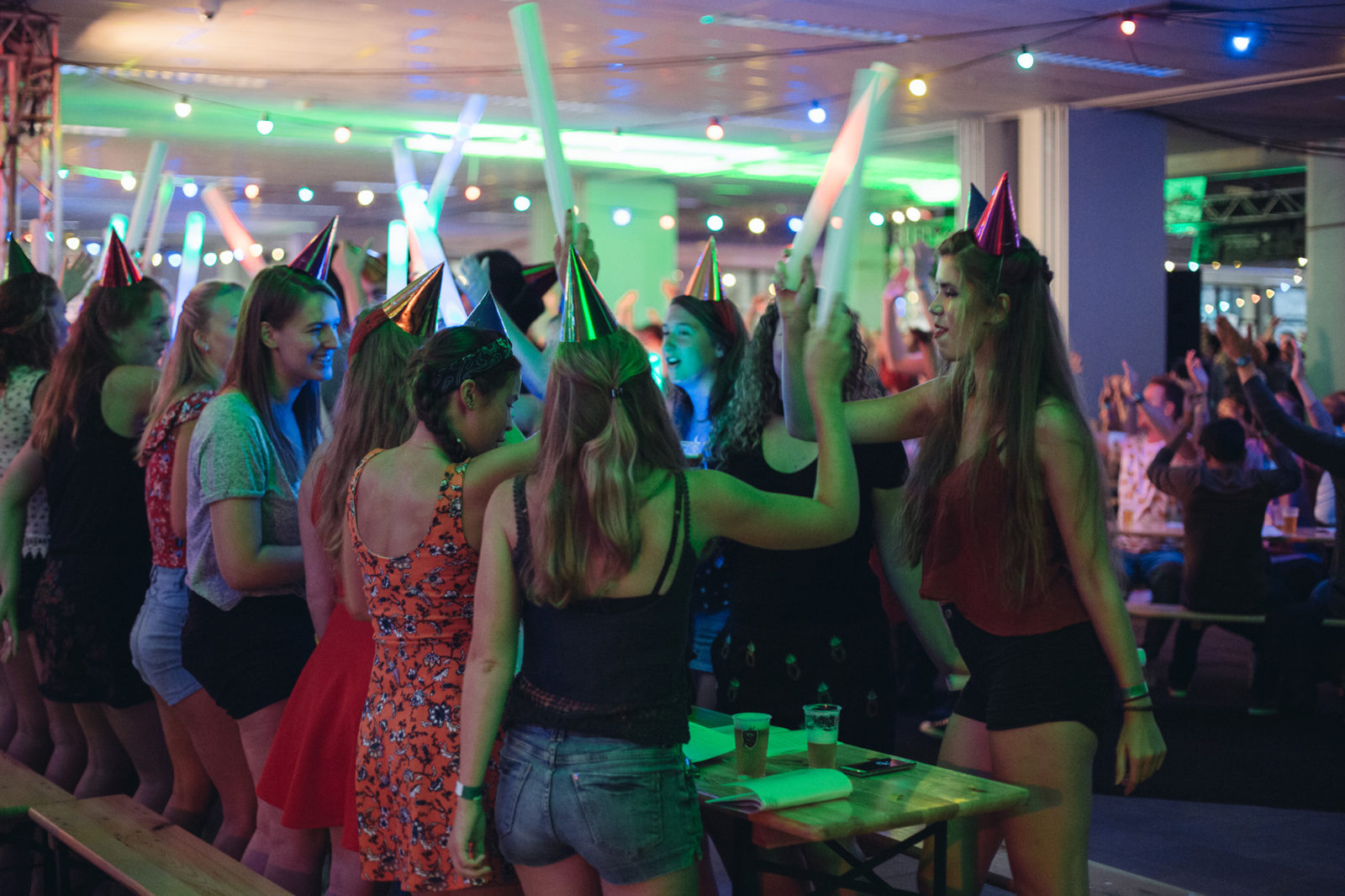 In het midden van de hal is een vierkant podium opgesteld waarop een grote band bekende feestliederen covert. Er hangt een uitgelaten sfeer en hoe verder de avond vordert, hoe losser en uitbundiger de kersverse studenten meedansen op de vrolijke muziek.