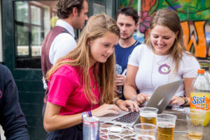 En op die festivalletjes merk je vanzelf wie geïnteresseerd is. “Meestal komen de studenten die twijfelen wel op je af stappen. Of ze drentelen een beetje onzeker om je heen”, lacht Wieke, ook tweedejaars lid. Ze stellen vooral vragen over de ontgroening, of over verschillen tussen Laurentius en het corps. Marja (links op de foto), eerstejaars lid, merkt op: “Vroeger zeiden we altijd dat het gemengde aspect van Laurentius het belangrijkste verschil is. Maar dat kan niet meer nu RSC en RVSV zijn gefuseerd.” Amber gebruikt vaak een ander argument: “Wat ik merk, en wat ik dan ook zeg tegen de twijfelaars, is dat wij bij Laurentius wat oprechter zijn dan bij het corps.”