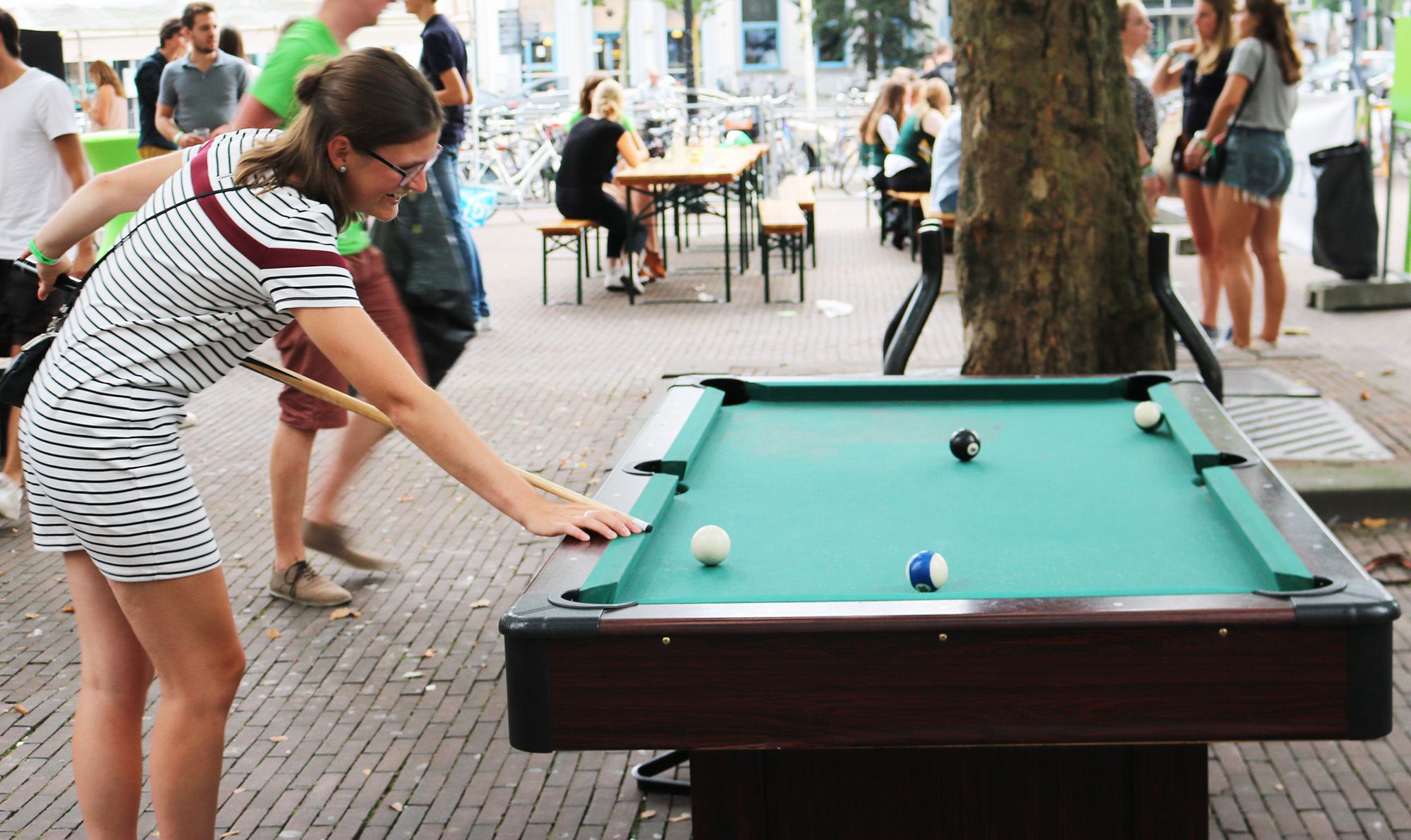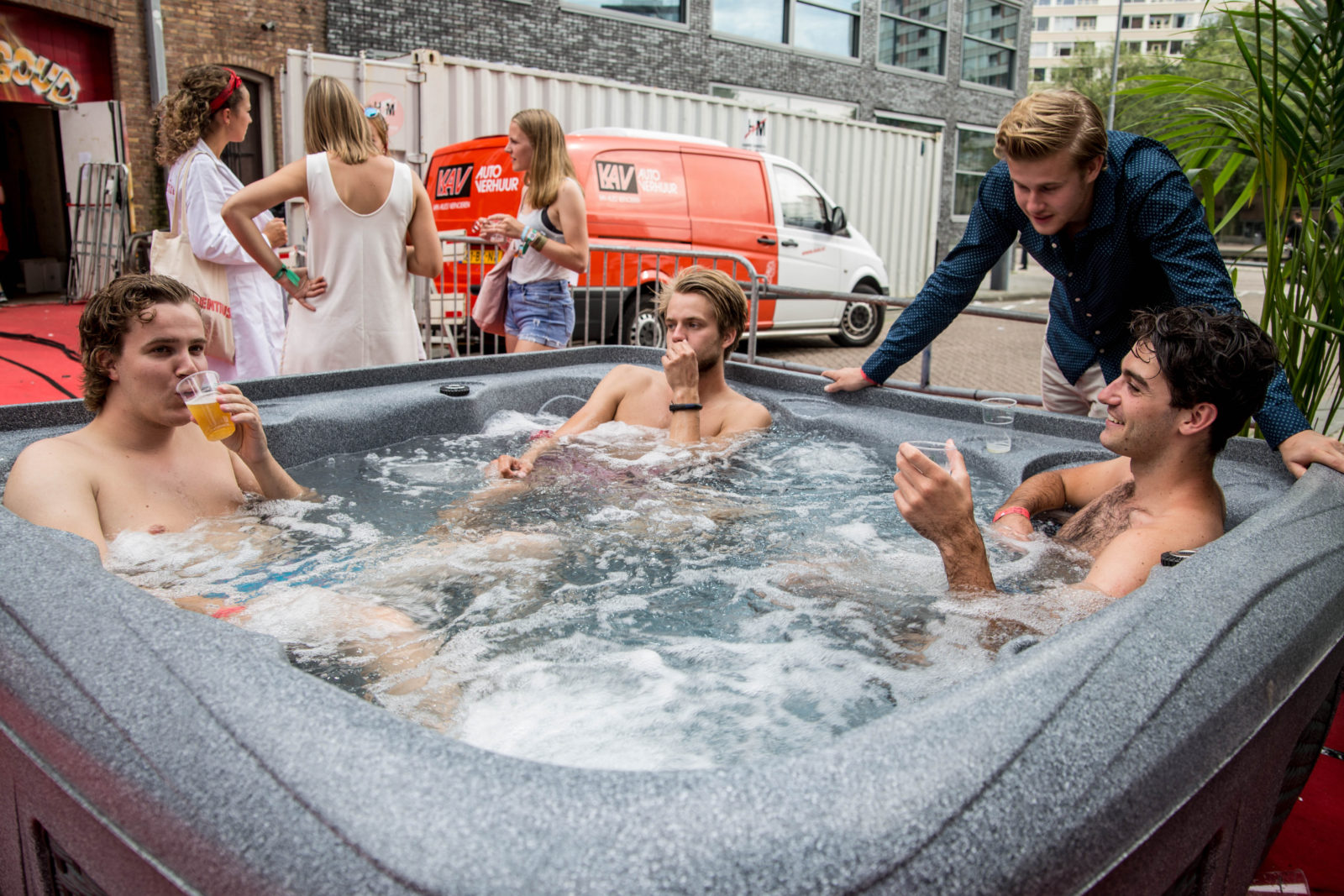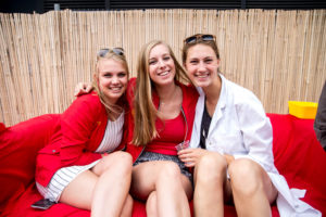 Het zijn vooral leden, te herkennen aan hun rode kleding, die aan het eind van de middag het terras van Laurentius bevolken. Er zijn nog weinig Eurekaweeklopers te bekennen. Daarom kan het promoteam van Laurentius even een beetje onderuitgezakt op de banken of in de jacuzzi uitbrakken. “Hier op het terras gaat het meer om informeel kennismaken, echt werven doen we op de festivalletjes van de Eurekaweek”, vertelt tweedejaars lid en geneeskundestudent Amber.