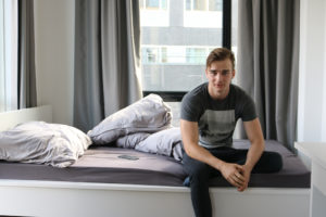 Dominik Filip uit Slowakije studeert Finance and Investment op de EUR. Hij vindt de kamer goed genoeg, maar heeft wel veel last van de herrie die vaak om zeven uur ’s ochtends begint. Daarnaast ontbrak er nog van alles in zijn gemeubileerde kamer. “Sinds gisteren heb ik pas een gordijn, daarvoor kon iedereen die buiten op de tram stond te wachten genieten van een live-show achter glas als ik me omkleedde, het enige wat er nog aan ontbrak waren de rode lichtjes.”