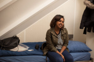 Bethiah deelt haar only girls slaapzaal met rechtenstudent Emma Bartley uit Australië. Ze ligt met haar laptop op het onderste bed van een stapelbed te studeren en heeft een handdoek aan het bed boven haar gehangen om een minimale vorm van privacy te creëren. “De studentenwoningen die door de universiteit aan internationals werden aangeboden waren binnen no-time volgeboekt”, vertelt ze. “Het leek wel de kaartverkoop voor een concert van U2.” Daarna zocht ze zonder succes op facebookgroepen, maar daar waren de prijzen te hoog of duurde het contract te lang. Ze is namelijk een uitwisselingsstudent en blijft maar vier maanden in Rotterdam. “Voor ik naar Stayokay kwam heb ik nog een tijd in ROOM geslapen, nu verblijf ik vanaf 1 oktober tot januari in drie verschillende airbnb’s. Dat is goedkoper dan hostelhoppen.”