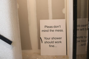 Het gebouw op stadhuisplein 30, aan de overzijde van de skihut, heeft alle potentie een prachtplek te worden. Maar zo ver is het nu nog niet. De hal is helemaal leeg en kaal, op een bord met mededelingen en een grote tafel na. Op de trap lopen werklui en ligt beschermend plastic. Borden met grappig bedoelde teksten staan op elke verdieping: “Please don’t mind the mess. Your shower should work fine.” En op de gang van de derde verdieping, naast de kamer van Faye Overbeek (18, Singapore) is een schilder bezig de muur zwart te schilderen.