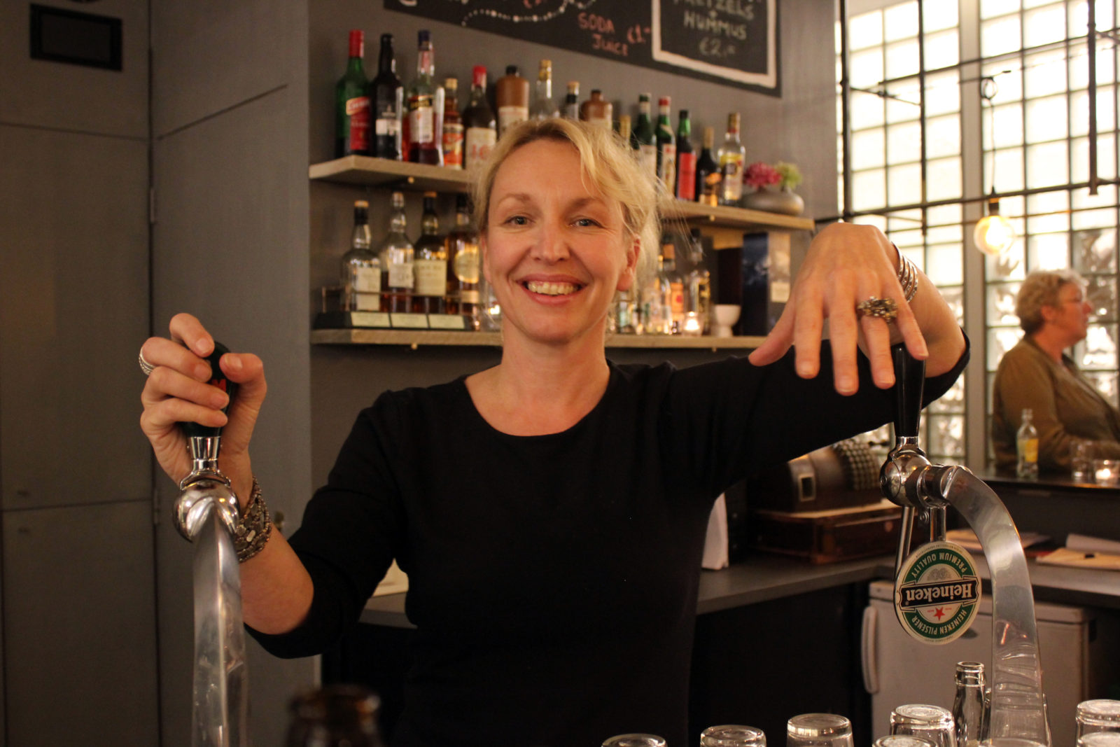 “Vinden jullie het erg als ik nog even de kaarsjes aansteek?”, vraagt Sandy om een uur of vijf op woensdagmiddag. De Butterfly is eigenlijk nog niet open, maar we zijn al welkom voor een biertje. “Ga zitten, dan zal ik jullie alles vertellen.” Ondertussen gaat haar telefoon continu. “Ik werk overdag in een galerie op Noordeinde (de chique winkelstraat tegenover het ISS)”, vertelt ze. “Mijn uren zijn daar aangepast, zodat ik hier achter de bar kan staan. En ik help ook nog een vriendin met haar styling-bedrijfje. Samen richten we huizen in voor de verkoop.”