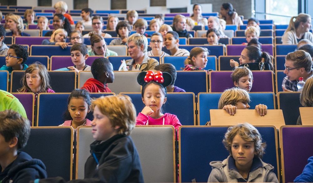 Basisschoolleerlingen krijgen filosofieles van decaan Wiep van Bunge tijdens het Erasmus Junior College. (EM 5, 17 oktober 2013). (RvdH)
