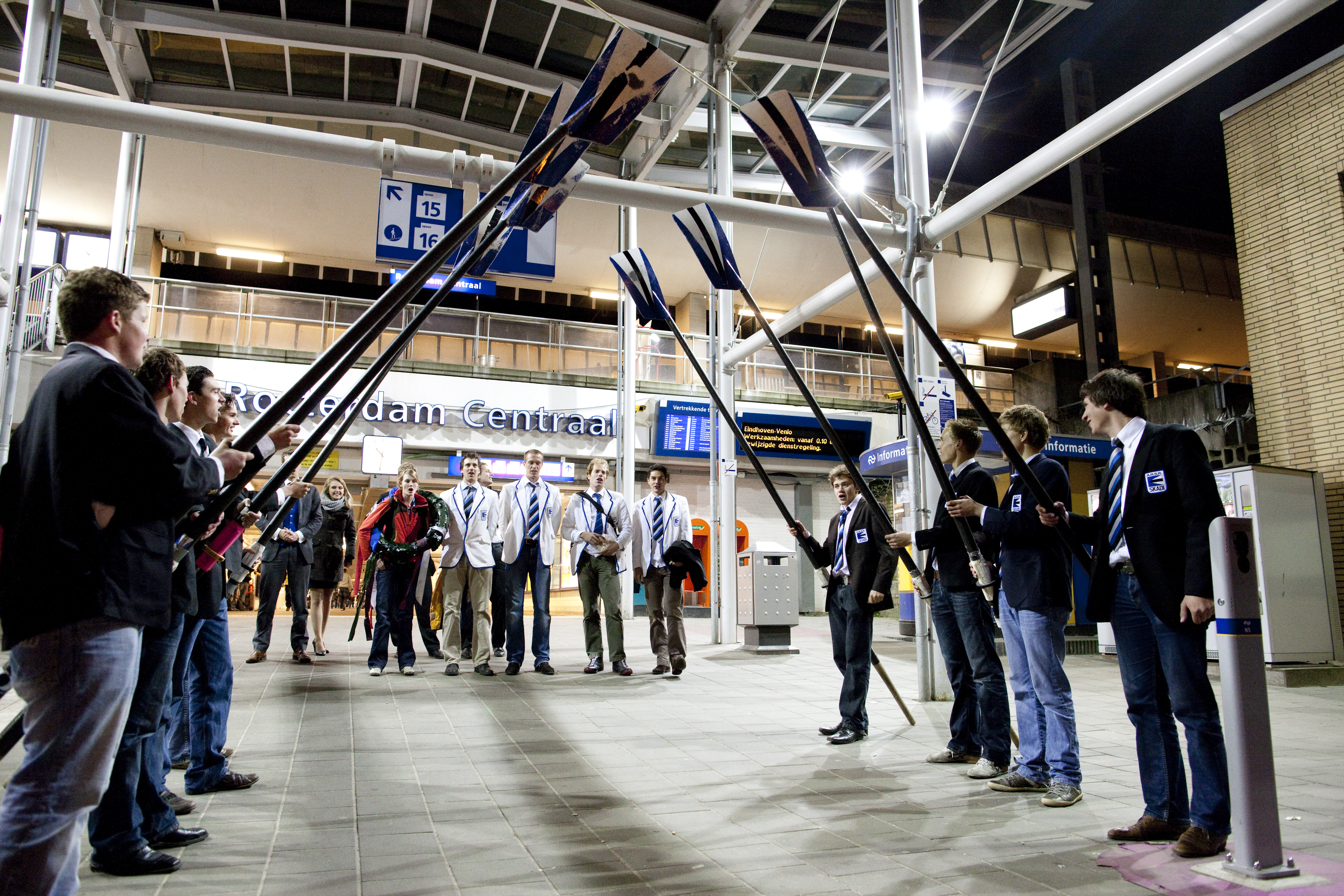 De Oude Vier van Skadi komt aan in Rotterdam na voor de vijfde maal in successie de Varsity te hebben gewonnen (EM 16, 15 april 2010). (LW)