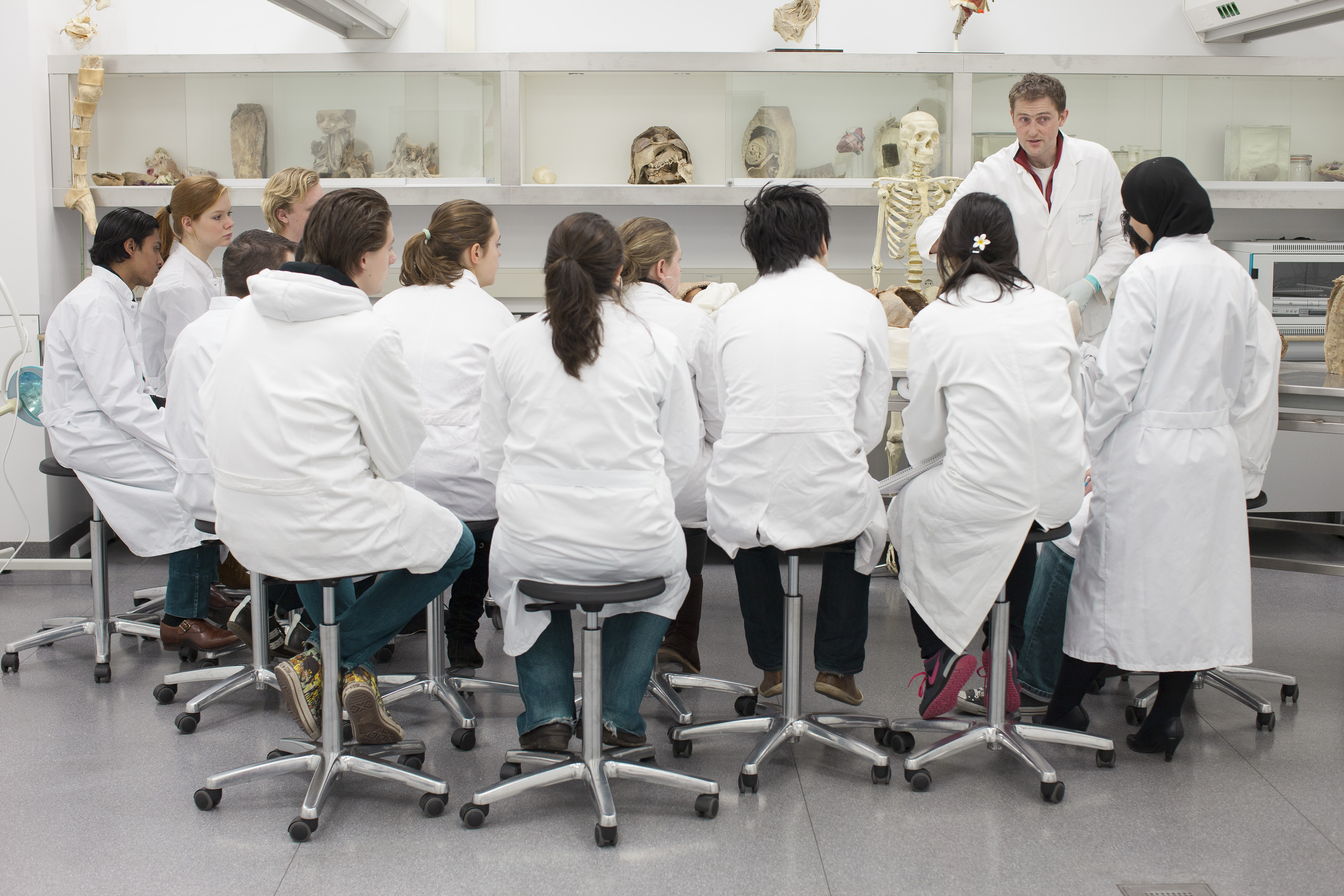 Studenten volgen een practicum anatomie in de snijzaal van het Erasmus MC (EM 12, januari 2009). (LW)