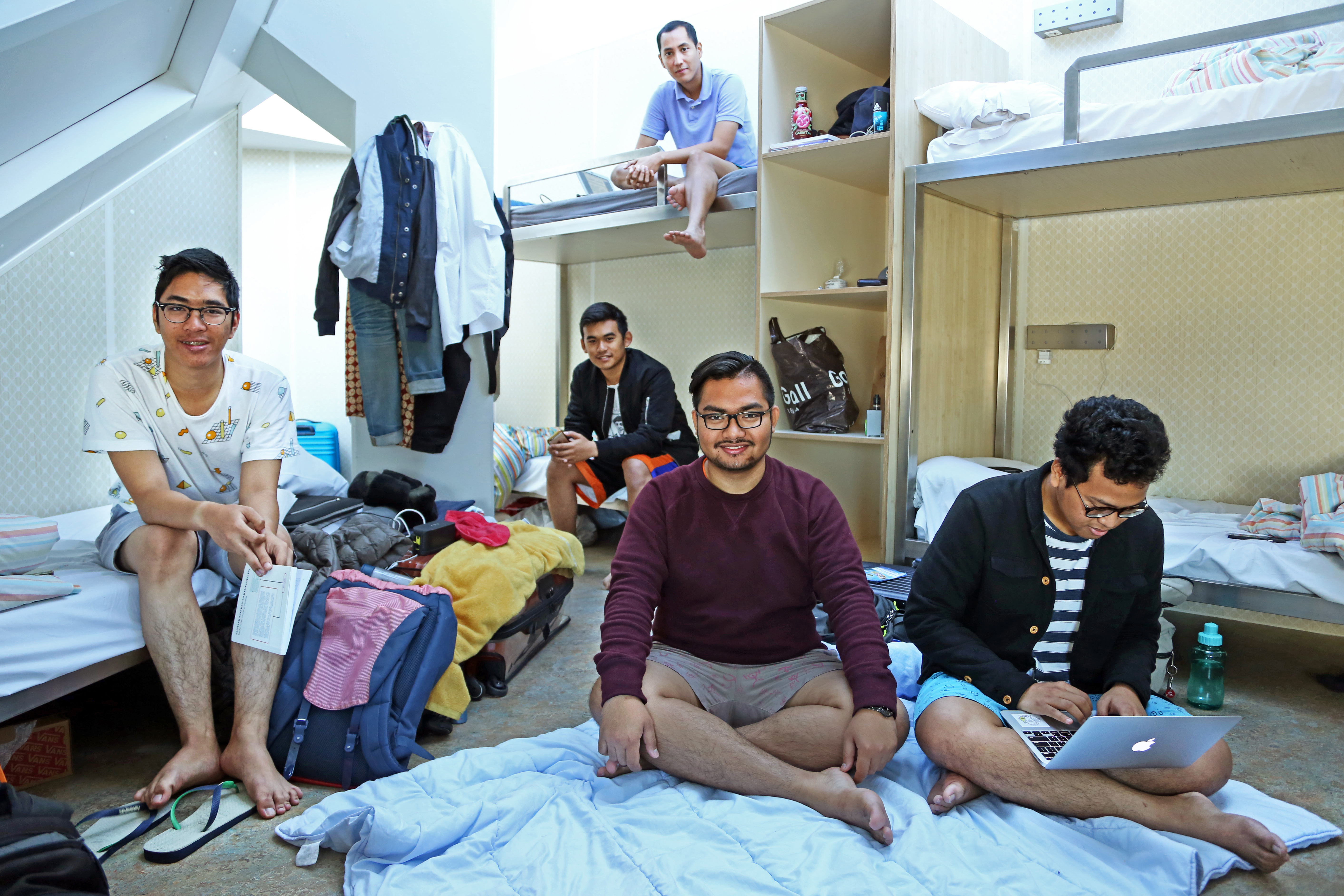 Studenten, allemaal jongens afkomstig van Java, op hun kleine kamertje in een Stay- Okay hostel. Bij een verhaal over de, soms schrijnende, woonsituatie van buitenlandse studenten (EM 2, oktober 2016). (SvdM)