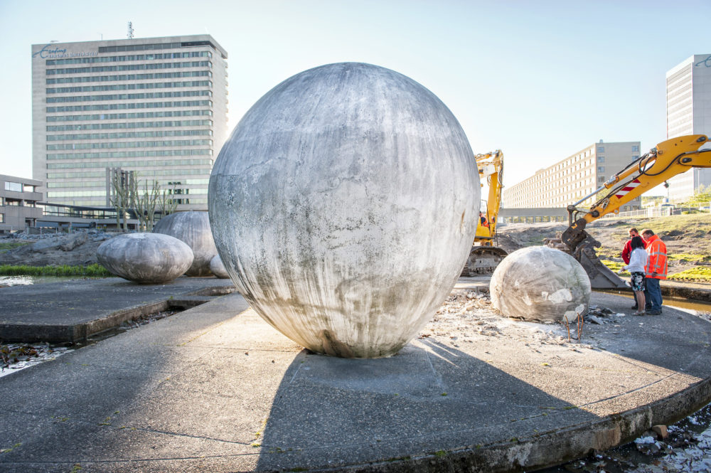 Lange tijd bepaalde het kunstwerk ‘De eieren van Petri’ de ingang van de campus aan de Burgemeester Oudlaan. Ooit bedoeld voor de eeuwigheid, ontliepen ook zij uiteindelijk de sloophamer niet (EM 18, 19 mei 2011). (RvdH)