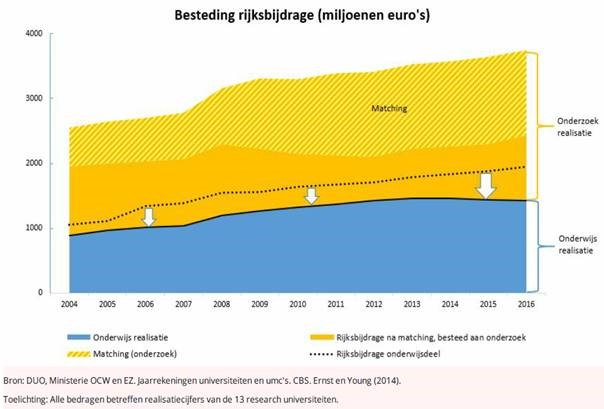 In de grafiek hieronder zijn de gevolgen te zien. De stippellijn verdeelt de rijksbijdrage aan de universiteiten in een deel onderwijs en een deel onderzoek. Een steeds groter deel van het onderwijsgeld gaat op aan onderzoek – mede door matching.