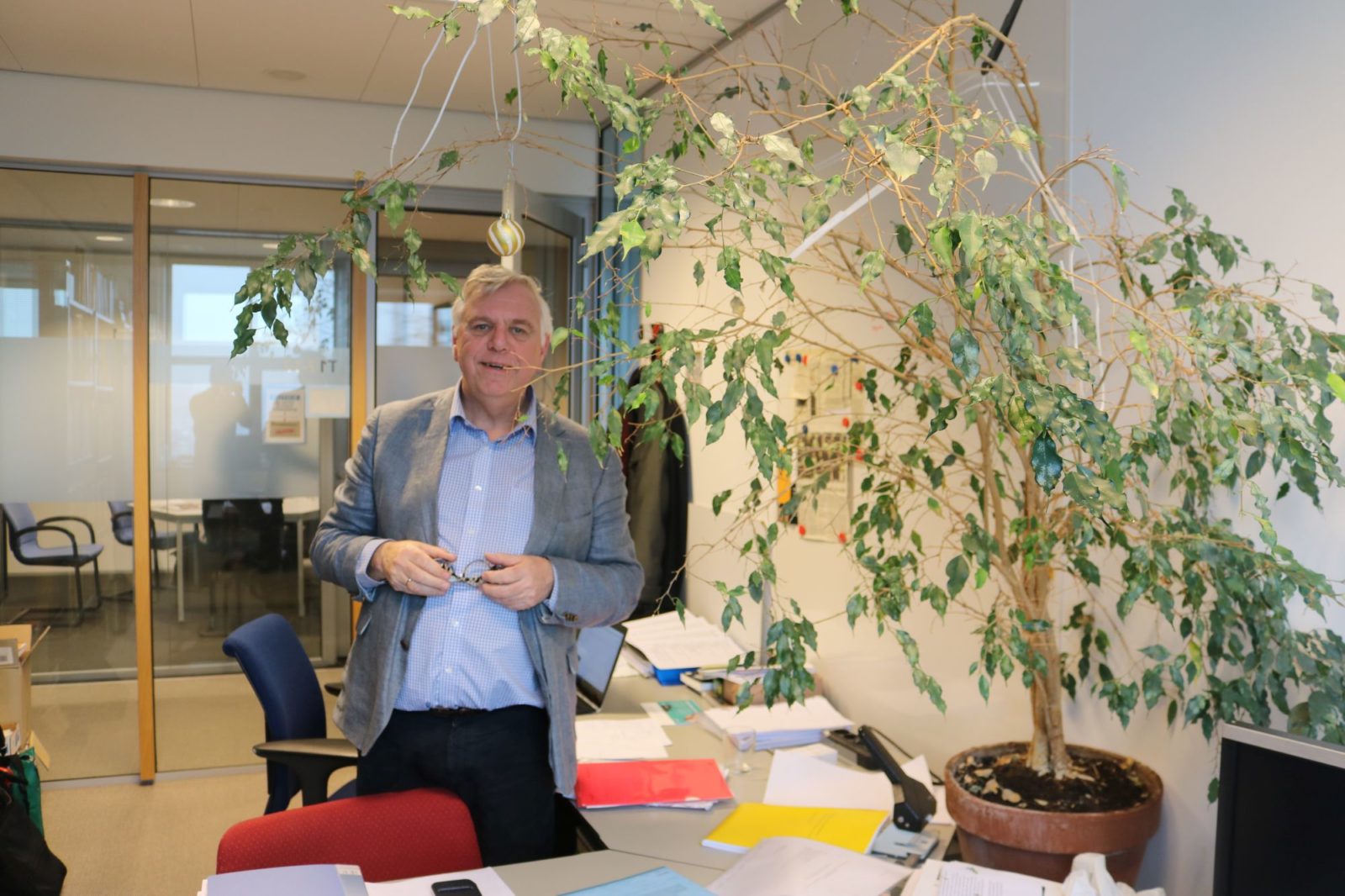 “Ik heb hem al zeker dertig jaar”, glundert Harry Geerlings, hoogleraar bij Bestuurskunde. Zijn kamergenoot Wim Hafkamp kijkt meewarig naar de gigantische plant die het midden van hun niet al te grote kantoortje domineert. “Hij werd thuis te groot, toen heb ik hem mee naar kantoor genomen.”