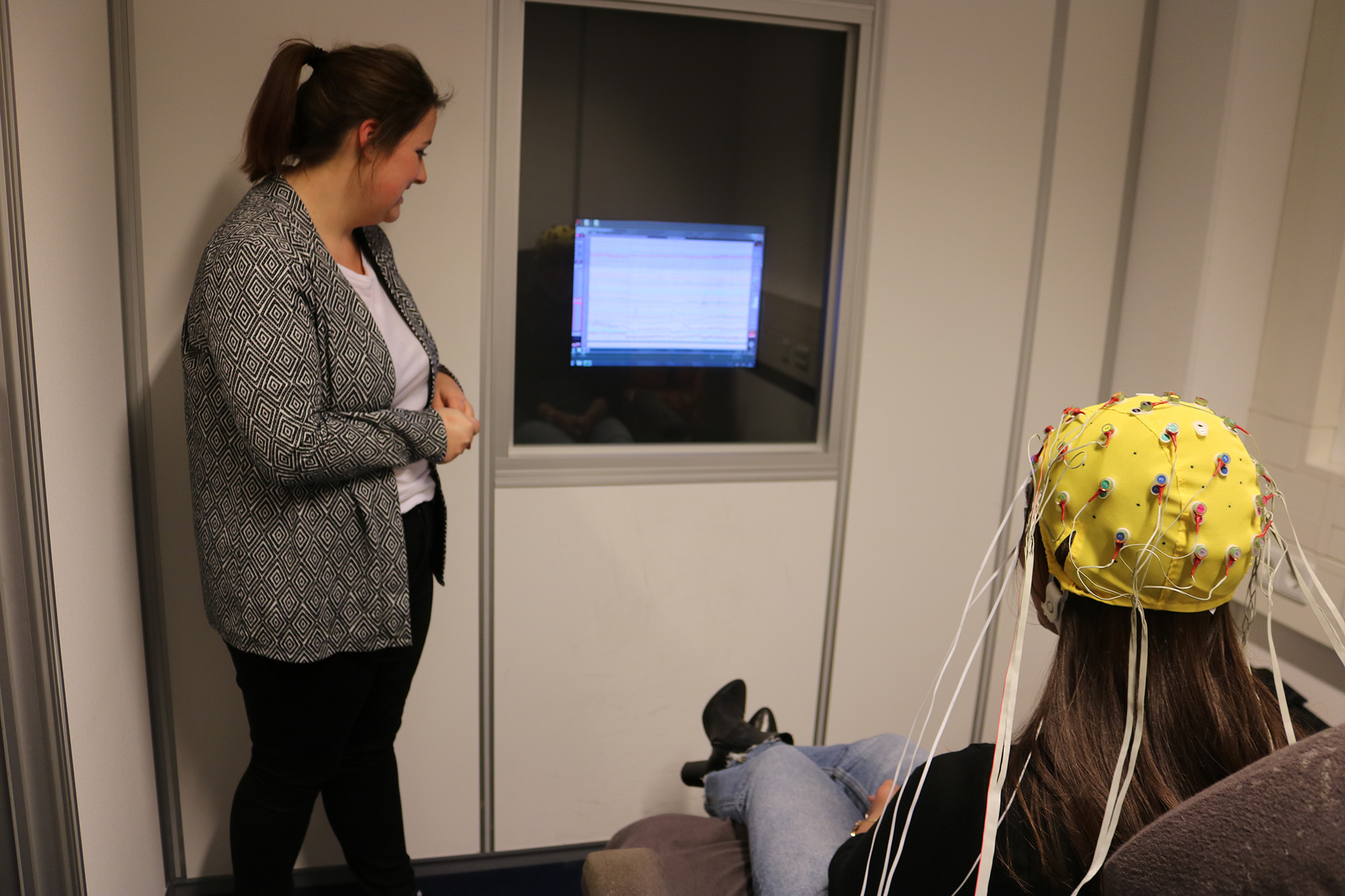 In een andere ruimte is een EEG-onderzoek aan de gang, hierbij kan de hersenactiviteit worden gemeten tijdens een experiment. Eerstejaars psychologiestudente Anush Ghukasyan ligt op een soort tandartsstoel terwijl een onderzoekster elektrodes aan haar hoofd vastmaakt. Voor haar studie moet Anush verplicht twaalf uur per jaar als proefpersoon optreden in het EBL. “Ik vind het wel spannend”, vertelt ze. “Dit is de eerste keer dat ik meedoe aan een EEG-onderzoek.”