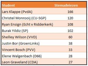Deelnemers aan de EM-stemwijzer De Slimste Stem hebben het vaakst het advies gekregen om op student Lars Klappe te stemmen. De PvdA’er studeert Internationale Economie en Rechtsgeleerdheid en zal waarschijnlijk niet veel kans maken om echt in de raad te komen: hij staat op de elfde plaats bij de sociaaldemocraten.