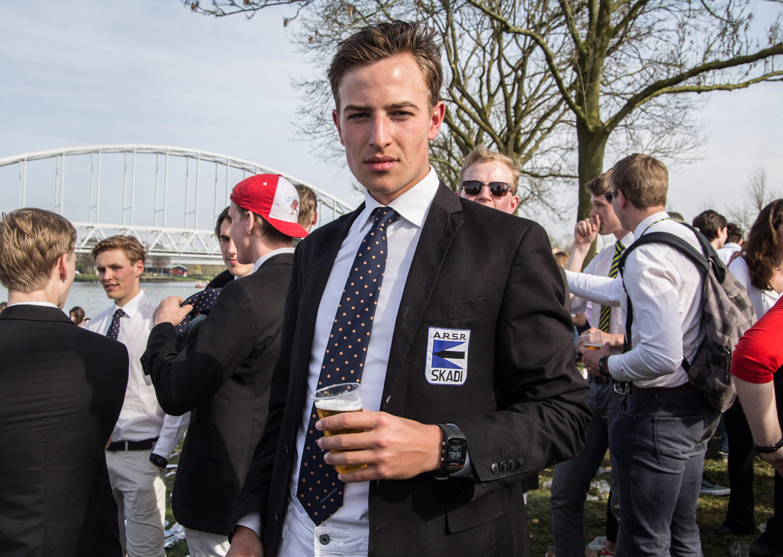 “Het gaat voor 99,9 procent om bier drinken en voor 0,1 procent om roeien”, legt Willem uit. “Volgens mij heb ik dit jaar tot nu toe ongeveer twee keer in de boot gezeten.” De schatting van Willem is niet echt een goede afspiegeling van de hele vereniging. De roeivereniging is onderverdeeld in de drinkende roeiers en de serieuze wedstrijdniveau roeiers, die gemakkelijk te herkennen zijn omdat ze geen dronken grijns op hun gezicht hebben en een blauw/zwarte Skadi-badge op hun blazer hebben.