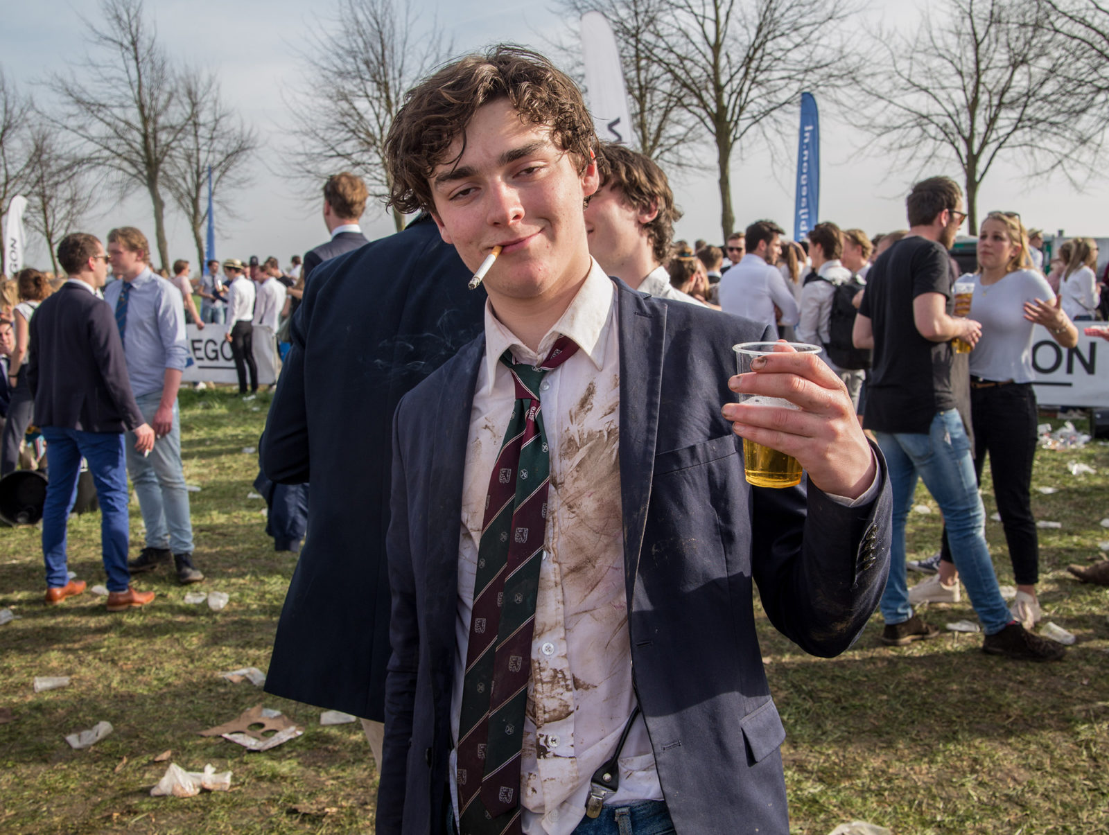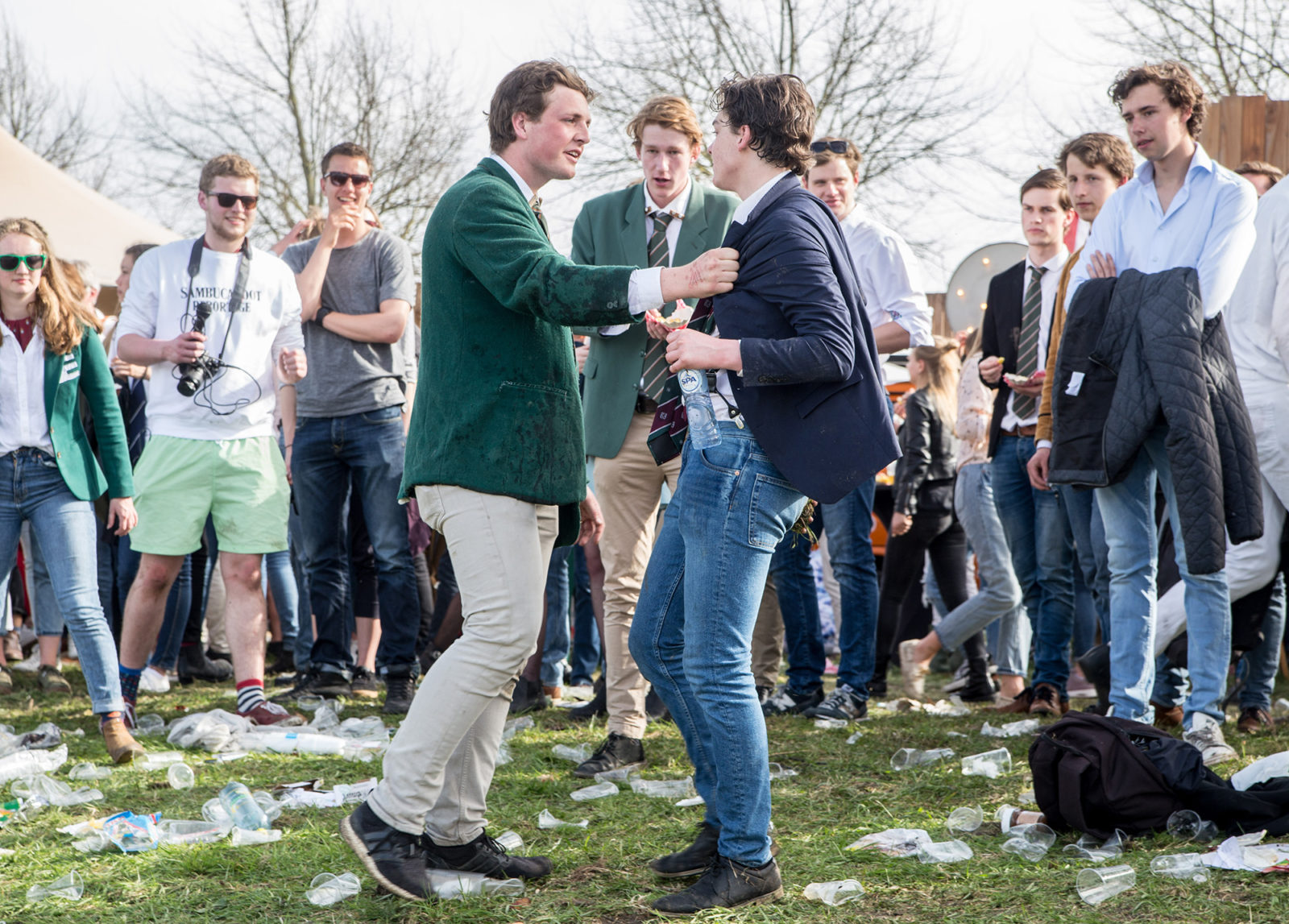 “Ik was niet van plan om vandaag te gaan vechten, maar die gast bleef maar modder naar me gooien”, zegt Ralf, wiens vieze groene blazer verraadt dat hij lid is van de roeivereniging Argo uit Wageningen. “Hij gedroeg zich egoïstisch en daar kon ik hem niet mee weg laten komen, dus ik dacht ‘ik moet hem tegen de grond werken’. Maar ik heb verloren, dus nu moet ik een biertje voor hem gaan halen.”