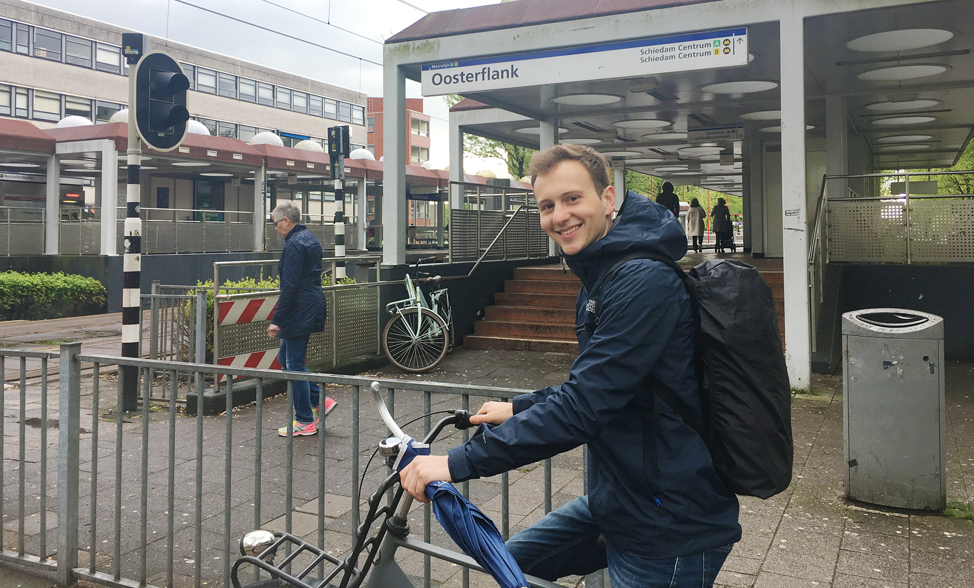 Gewoonlijk stapt Tim van Doorne (20) zonder schroom op de fiets richting de universiteit, maar omdat het vandaag de hele dag regent, is hij bij Oosterflank de metro ingestapt. “Met de fiets ben ik eigenlijk sneller dan met openbaar vervoer. Ik doe er een half uur over, net zo lang als iemand die in Blijdorp woont.”