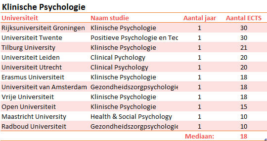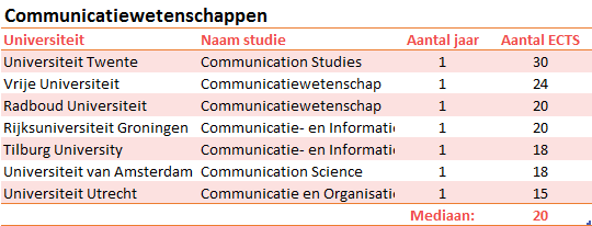 Tien studiepunten of dertig? Ook andere studierichtingen kennen flinke verschillen in het gewicht dat de scripties krijgen. We hebben ter illustratie nog twee opleidingen in een tabel gezet: communicatiewetenschappen en klinische psychologie.