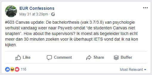 De begeleider kon de opdrachten van studenten nergens vinden. “De bachelorthesis van Psychologie verhuist vandaag weer naar Psyweb omdat ‘de studenten Canvas niet snapten’. How about the supervisors? Ik moest als begeleider toch echt meer dan dertig minuten zoeken voor ik überhaupt iets vond dat ik na kon kijken”, valt te lezen op de facebookpagina. Een facebookpost eerder gaat ook al over Canvas. ‘Studenten: wij haten Canvas’ staat er.