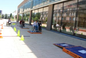 De rolstoelrace op de Erasmus Plaza gaat bijna beginnen. Enkele studenten en medewerkers proberen gauw de rolstoelen onder controle te krijgen voordat ze straks aan de race beginnen. Student Sanne, die wél een rolstoelgebonden bestaan leidt, kijkt lachend toe en geeft advies aan de deelnemers. “Een rolstoel bedienen gaat niet om kracht; het is meer een handigheid die je gaandeweg moet krijgen.”
